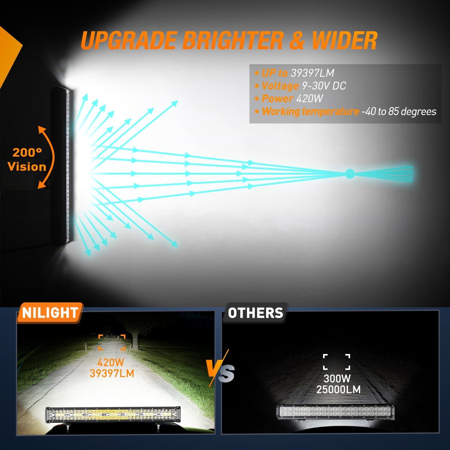 Nilight 20 Inch 420W LED Light Bar Yellow Triple Row Flood Spot Combo 42000LM Driving Boat Led Off Road Lights with 12V On/Off 5 16AWG Wiring Harness Kit, 2 Years Warranty(White Light + Wiring Harness)