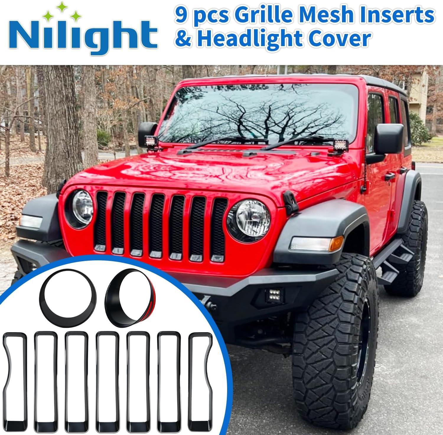 Nilight Grill Inserts fit for Jeep Wrangler Front Grille Inserts Headlight Cover Set for JL JLU Unlimited Sport SportS 2018 2019 2020 2021 2022 2023 Grille Bezels Trim Exterior Accessories Black 9 Pcs