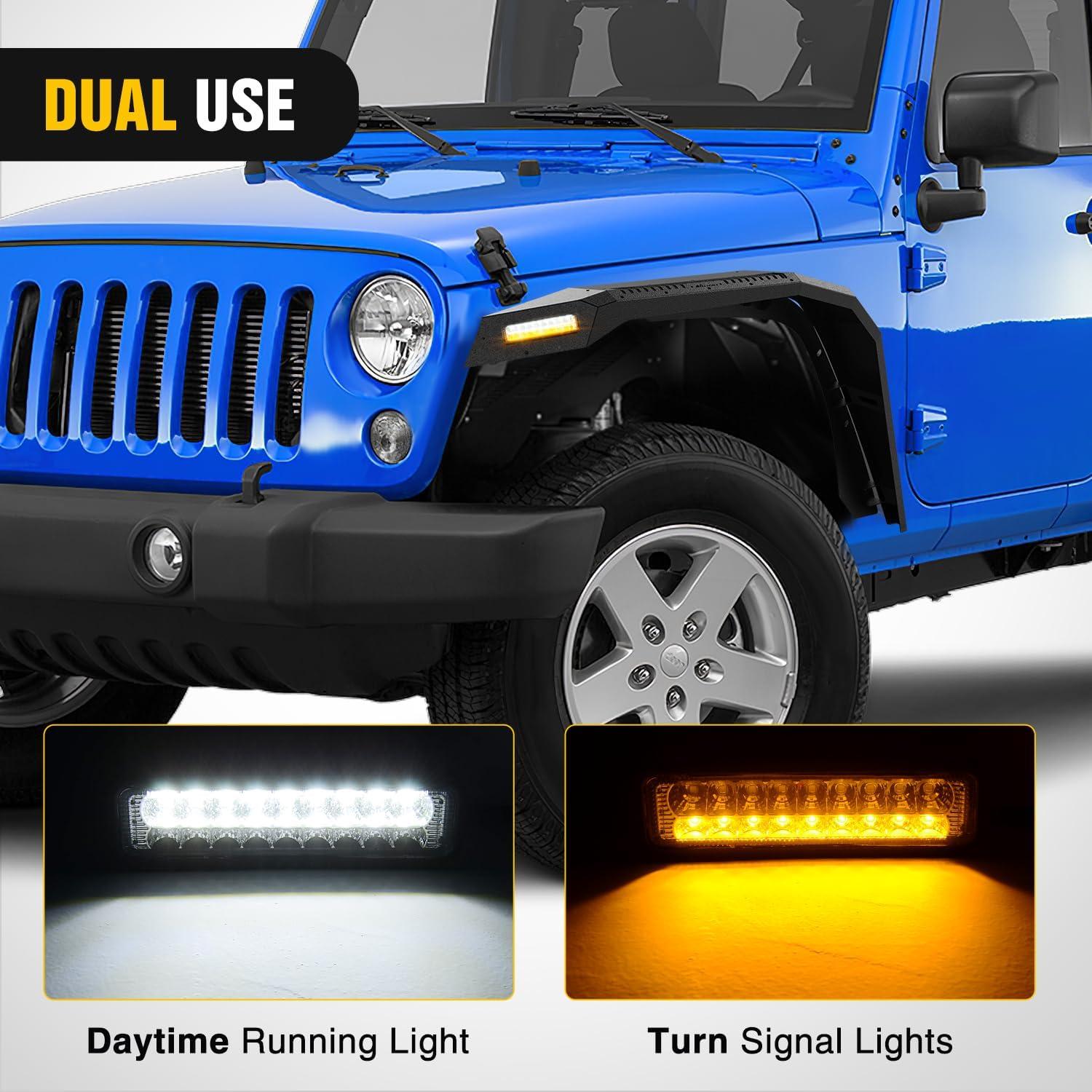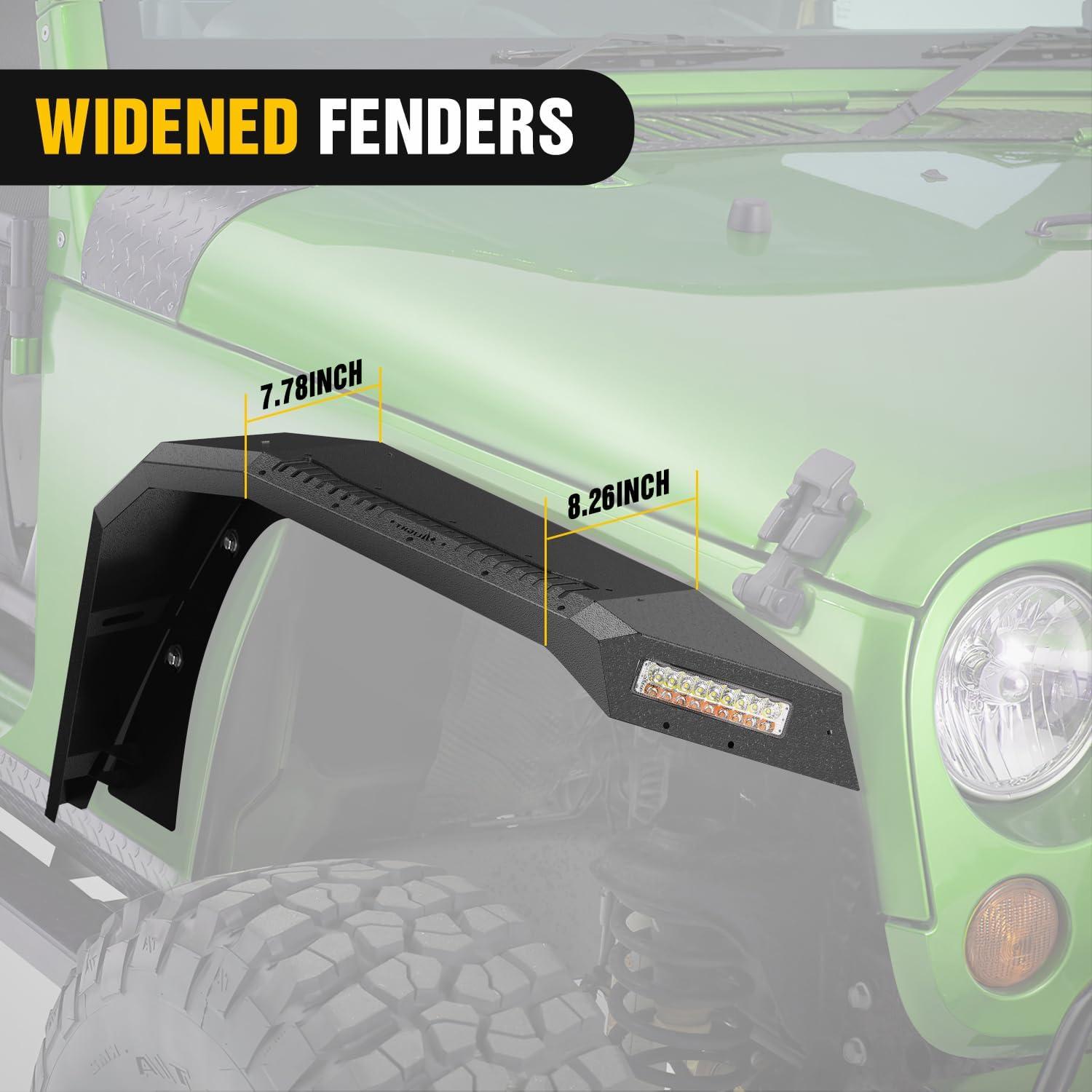 Nilight JK Wide Flat Front & Rear Fender Flares Fit for 2007-2018 Jeep Wrangler JK 2Door (Not fit 4 Door) 4Pcs Off-Road Wheel Fenders Mud Guards w/LED Lights Turn Signal Lights DRL, Heavy-Duty Steel