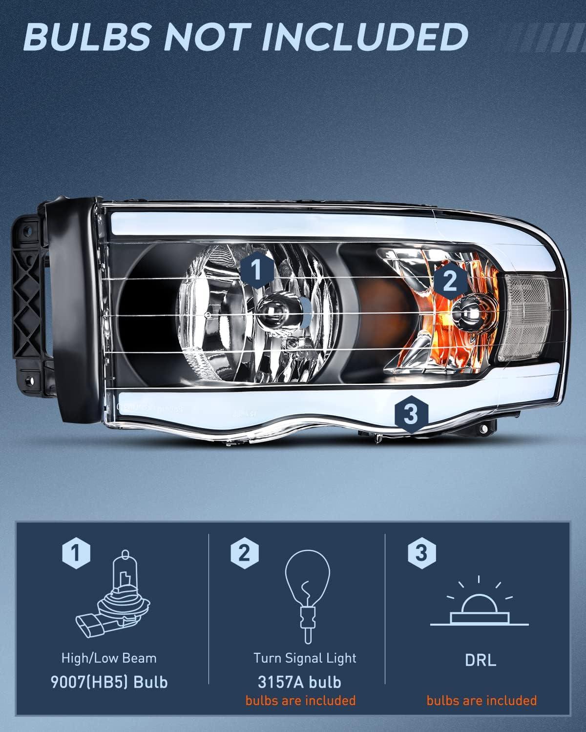 Nilight 2002 2003 2004 2005 Ram 1500 2500 3500 Headlight Assembly Chrome Housing Amber Corner Clear Lens Headlamp Replacement Driver and Passenger Side 2 Pack(Black Housing + Amber Reflector DRL)