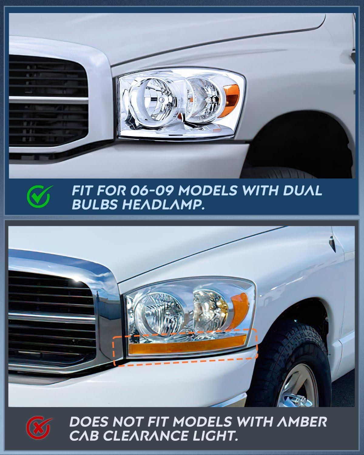 Nilight 2007 2008 2009 Dodge Ram Headlight Assembly 2 Pack Compatible with 2006-2008 Dodge Ram 1500 2006-2009 Dodge Ram 2500 3500 Headlamp Replacement Driver and Passenger Side(Chrome Housing +Amber Reflector)