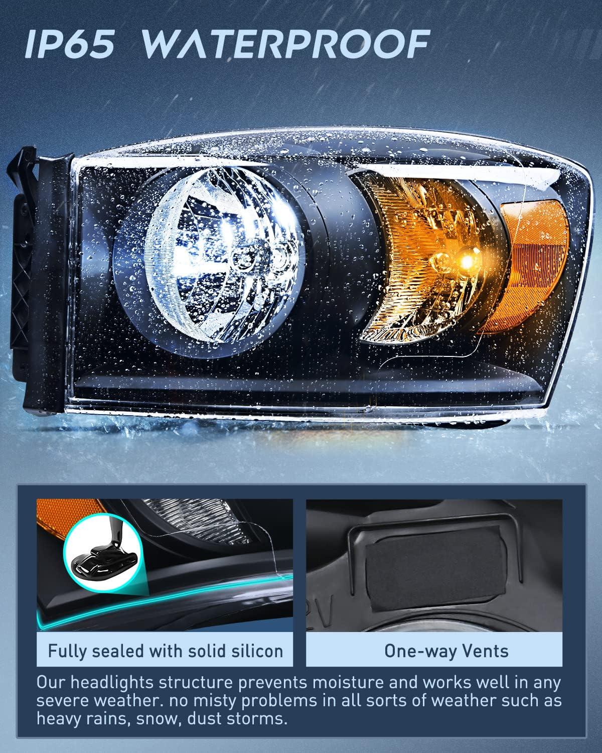 Nilight 2007 2008 2009 Dodge Ram Headlight Assembly 2 Pack Compatible with 2006-2008 Dodge Ram 1500 2006-2009 Dodge Ram 2500 3500 Headlamp Replacement Driver and Passenger Side(Black Housing + Amber Reflector w/Taillight)