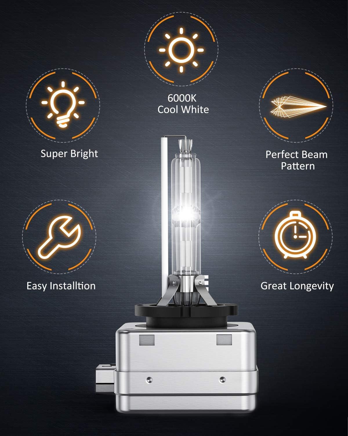 Nilight D2S HID Headlight Bulbs, Diamond White, 35W, 85V, 3000 Hours Lifespan, Anti-UV Quartz Glass, D2S Standard Fit