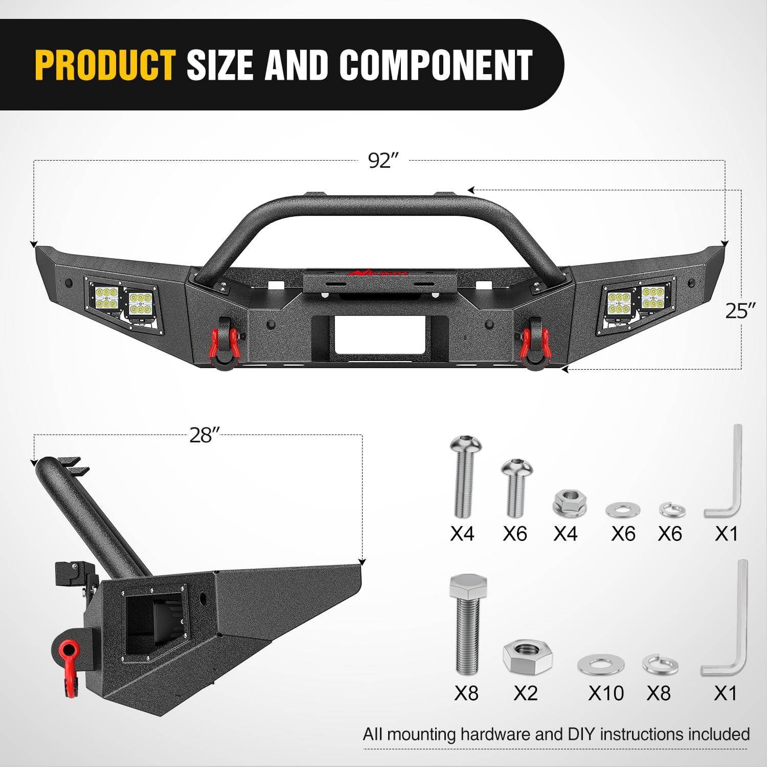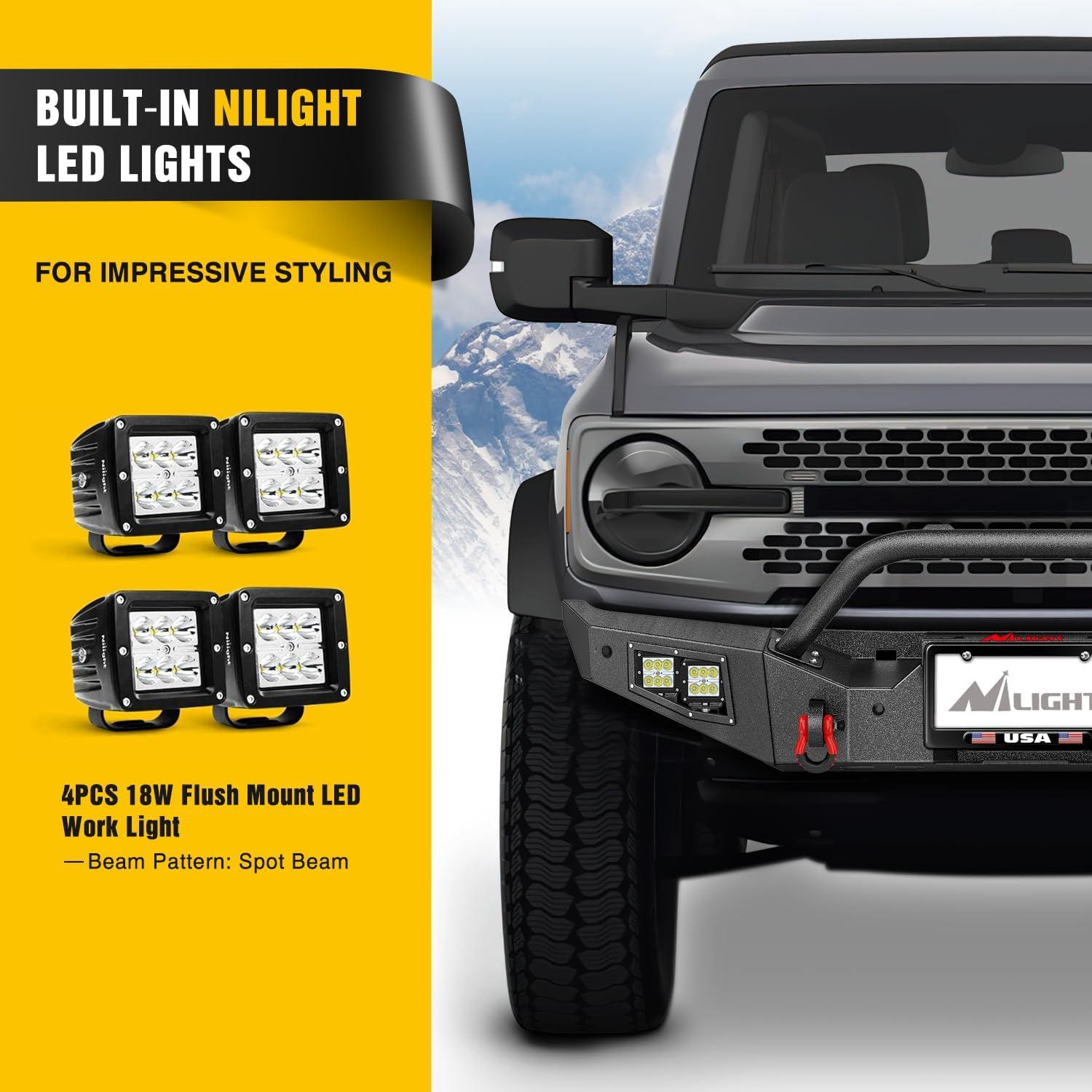 Nilight Front Bumper Compatible for 2021 2022 2023 2024 Ford Bronco with 4X 18w Flush Mount LED Work Lights Winch Plate License Plate Bracket Sensor Hole