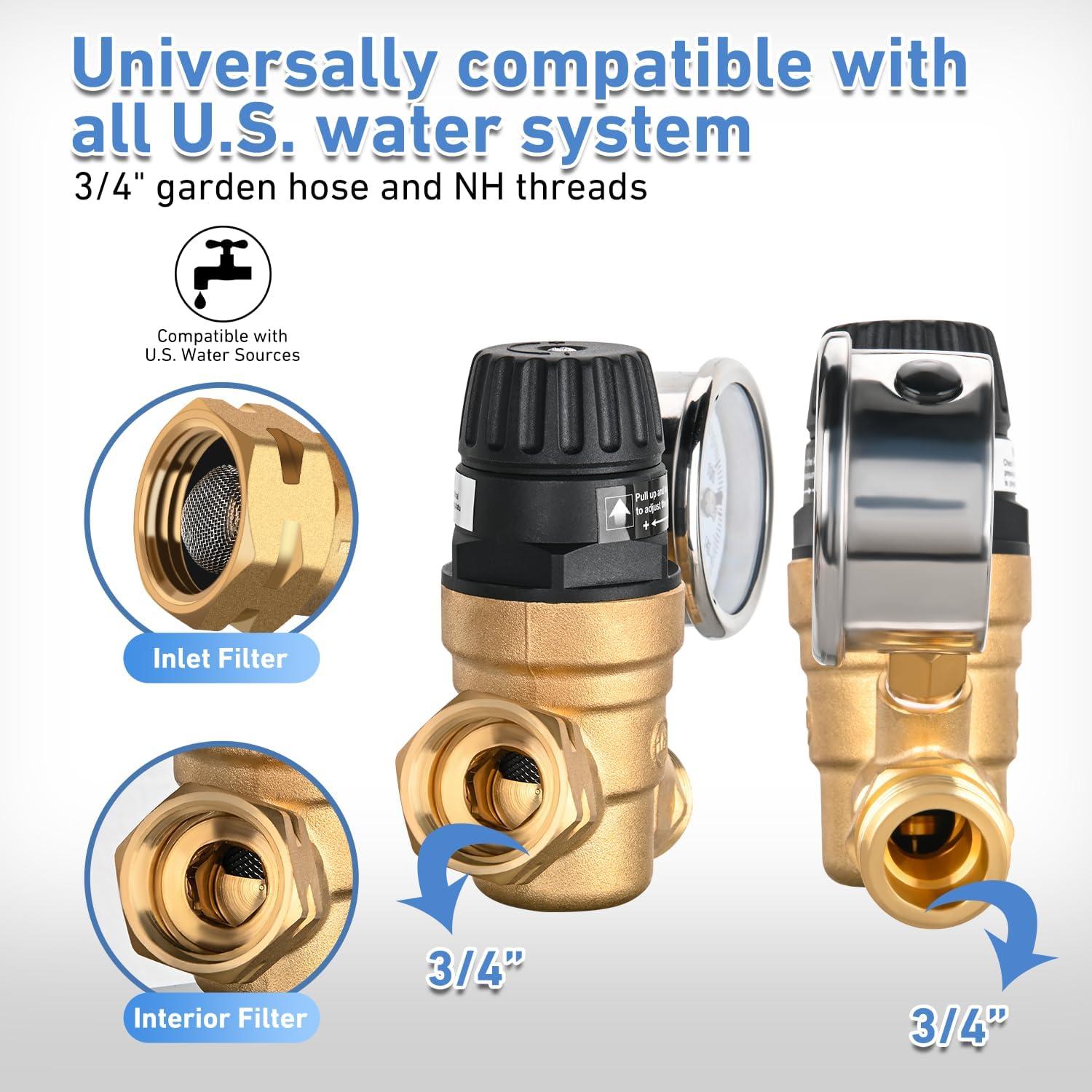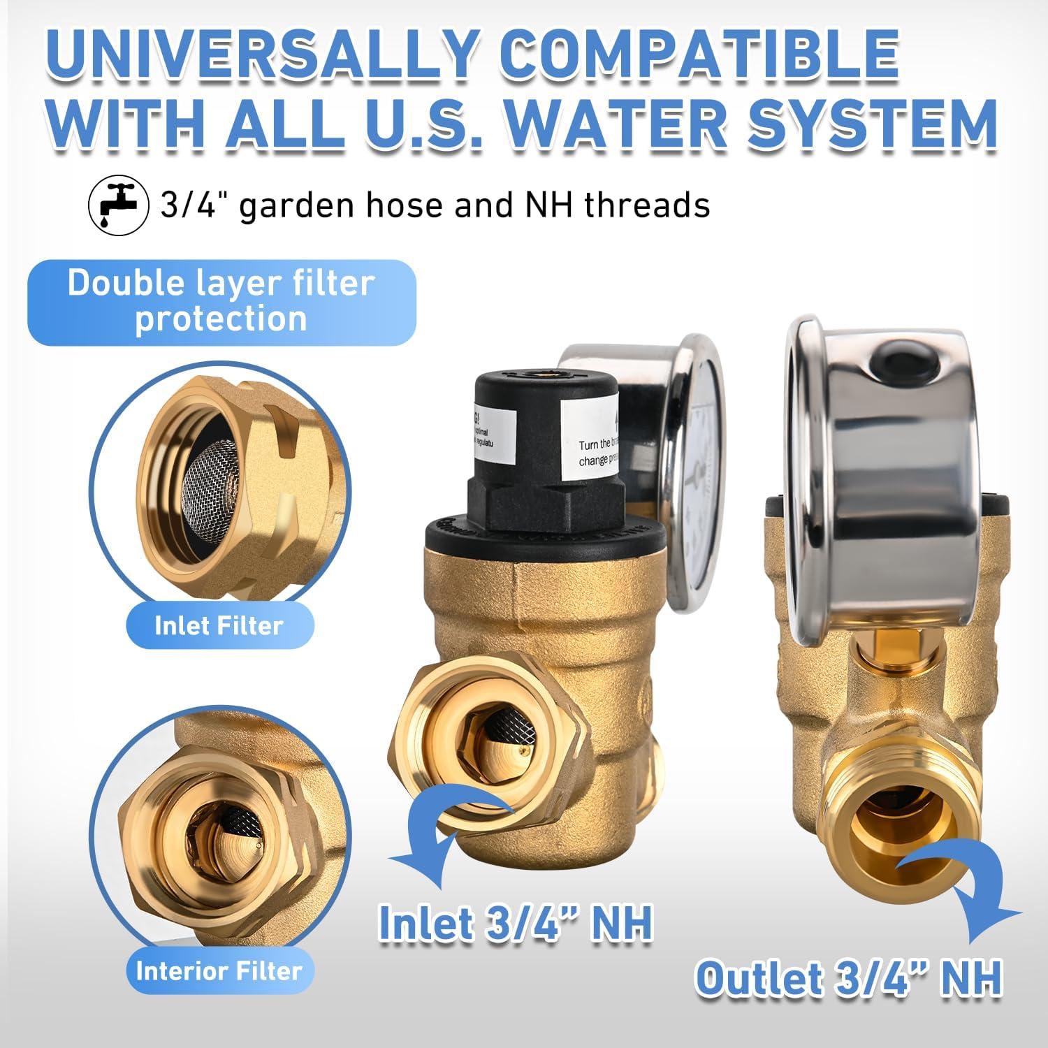 Nilight RV Water Pressure Regulator for RV Camper, Water Hose Pressure Regulator with Oil Filled Gauge and Inlet, Brass Lead-free Adjustable RV Water Pressure Regulator Valve for Camper Travel Trailer(Inlet Check Valve)