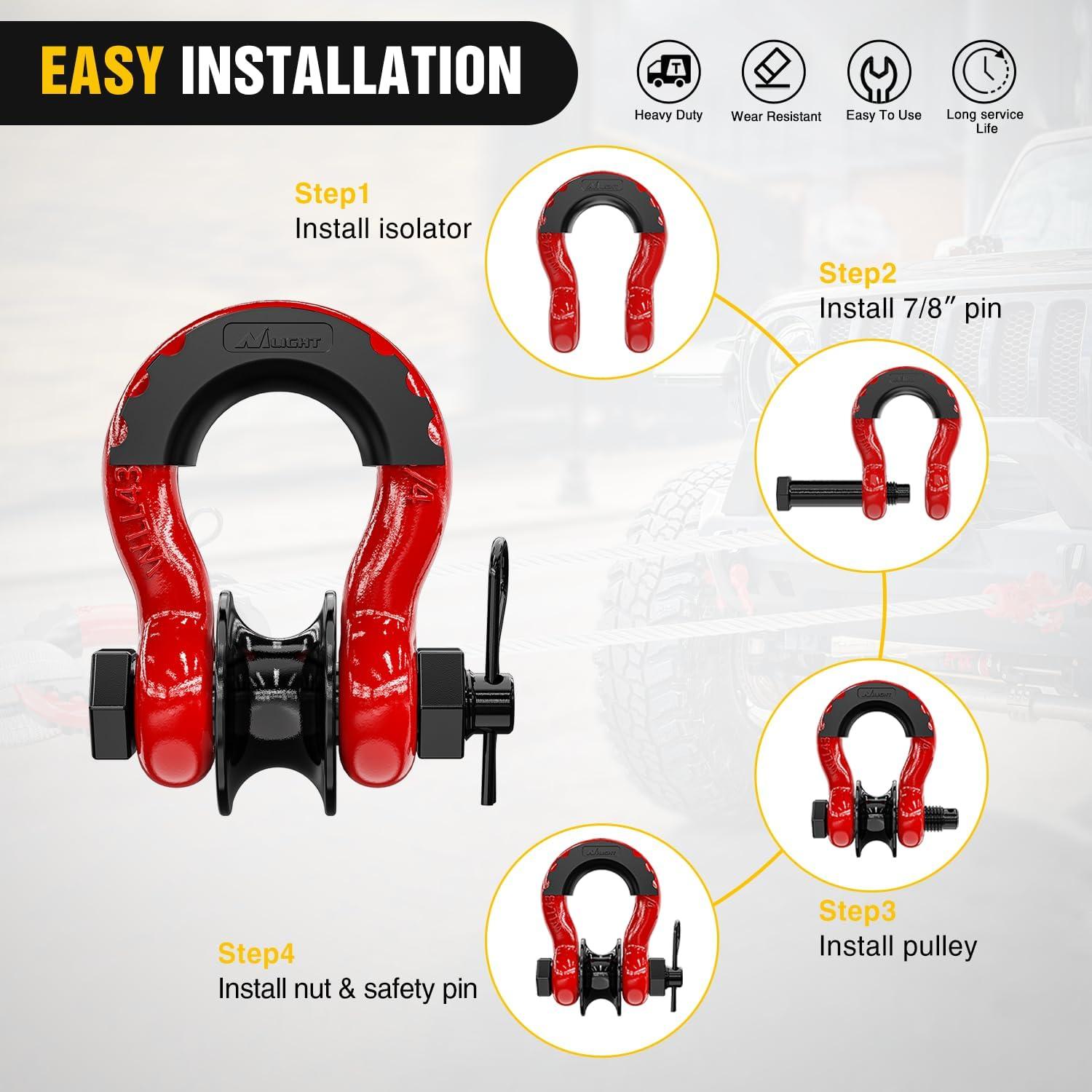 Nilight 2 Pack 3/4″ D-Ring Shackle with 7/8″ Screw Pin 41,887lbs Break Strength, Heavy Duty Off Road Recovery Shackle with Isolators Washers for Use with Tow Strap, Winch, Off-Road Jeep Truck Vehicle(Red w/Towing Pulley)
