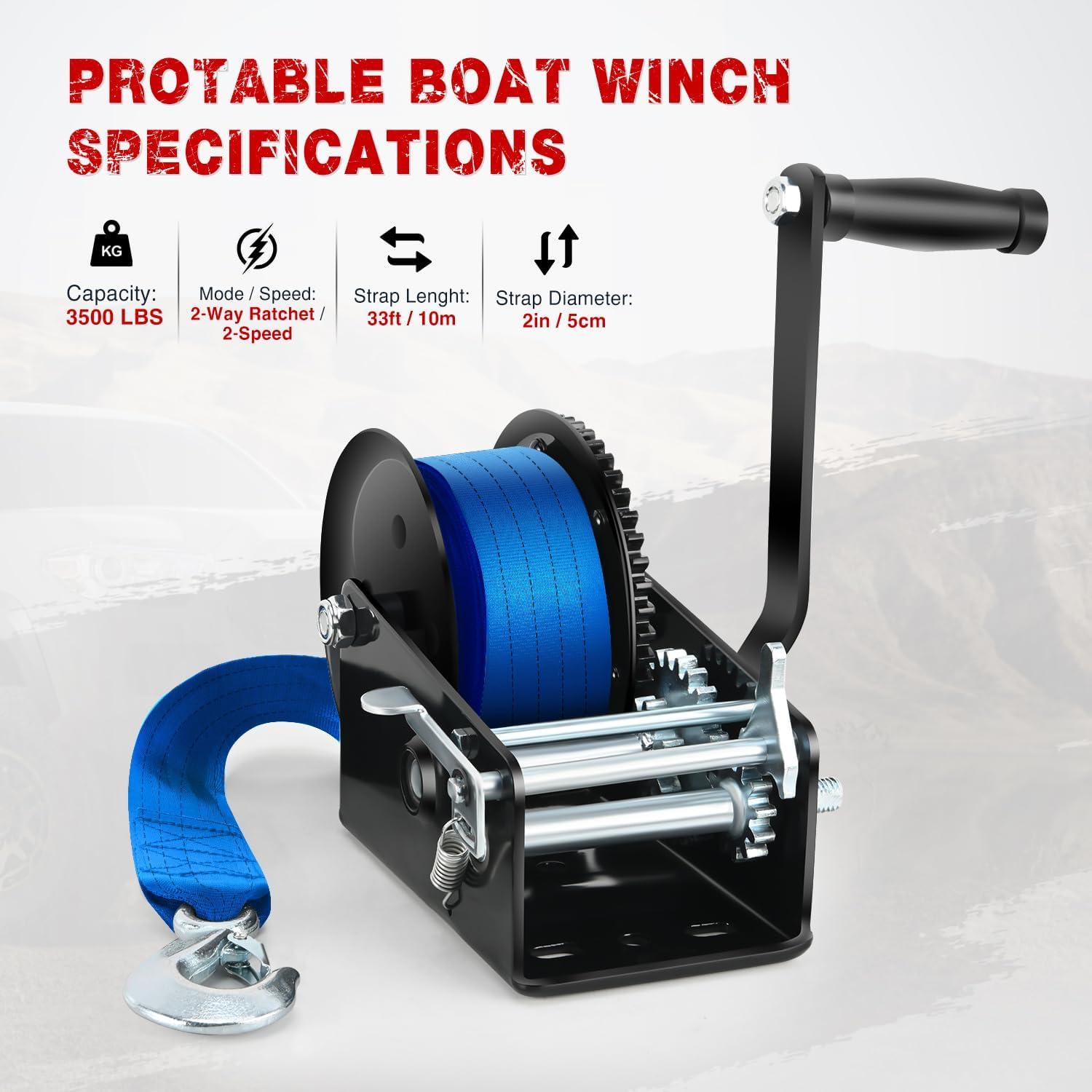 Nilight Boat Trailer Winch 3500 LBS Hand Crank Winch Heavy Duty Boat Winches with 33 FT Orange Strap Rope Hook Two Way Ratchet 4:1 8:1 Gear Portable Marine Manual Winch for Trailers Boat RV ATV Towing(Blue)