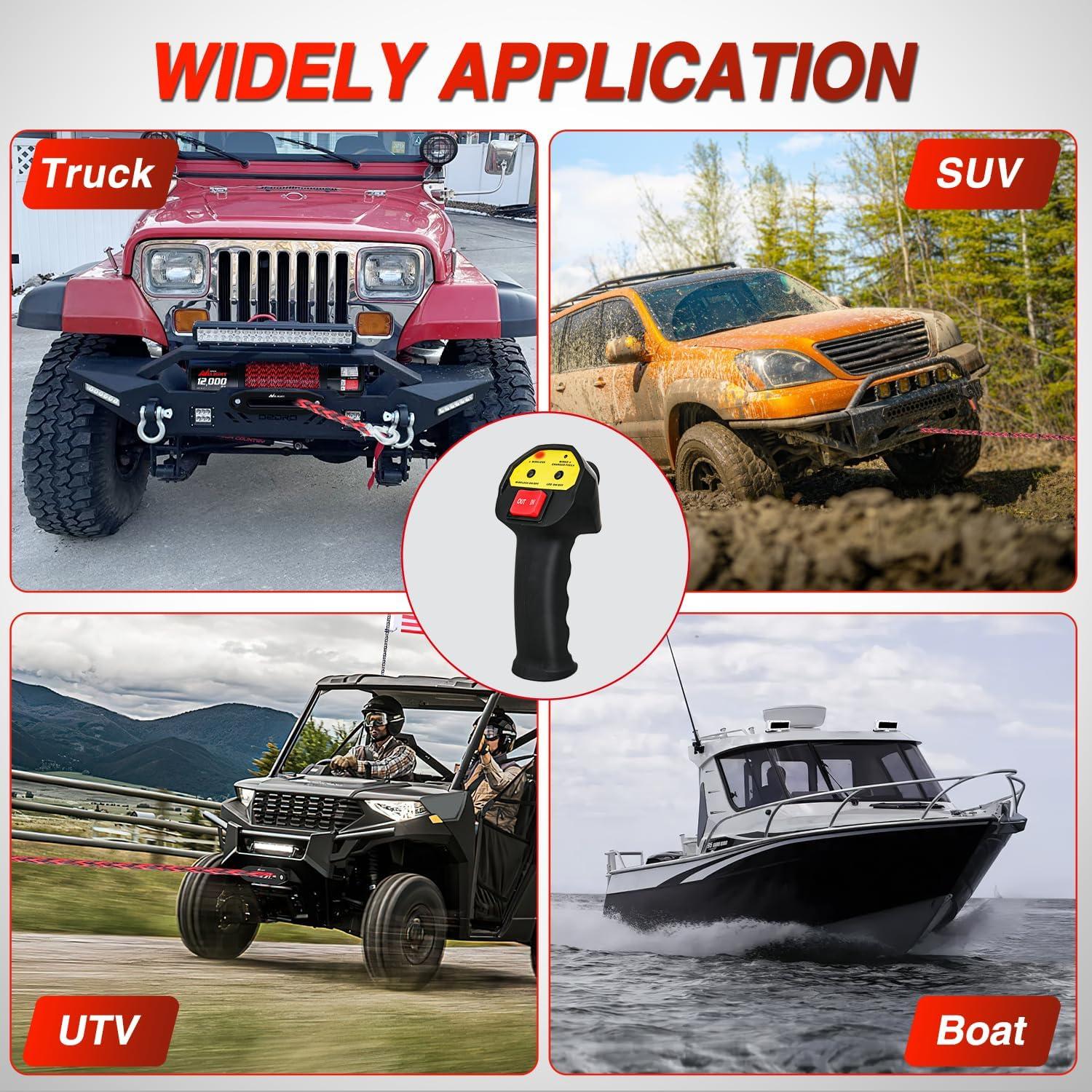 POWERFUL TOWING: The new electric winch is powered by a 4.8kw/6.5hp output permanent magnet DC 12V motor with 12,000 lbs/ 5454 kg load capacity and comes with 9mm x 24m/ 3/8″x 79ft winch synthetic rope. The winches effortlessly handle off-road rescues and is widely applicable to atv, utv, automobile, boat, truck, jeep, SUV, modified vehicles, multi purpose utility trailers and more