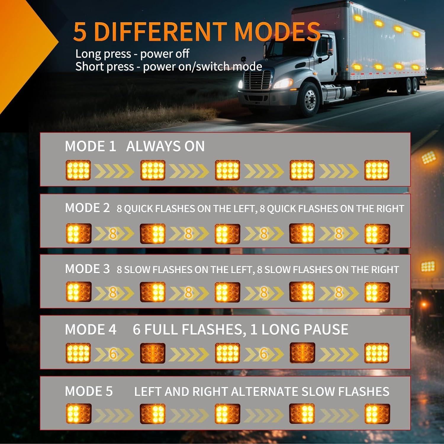 Versatile Modes: The 12LED trailer taillights feature 5 flashing modes and a convenient on/off button, providing multiple strobe modes to effectively warn other vehicles; simply use the red button to switch the flashing mode, press and hold for 2 seconds to control the light bar to turn off, with memory call mode.