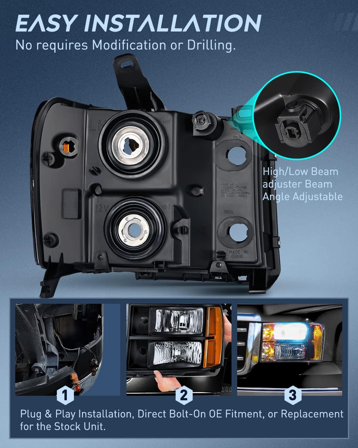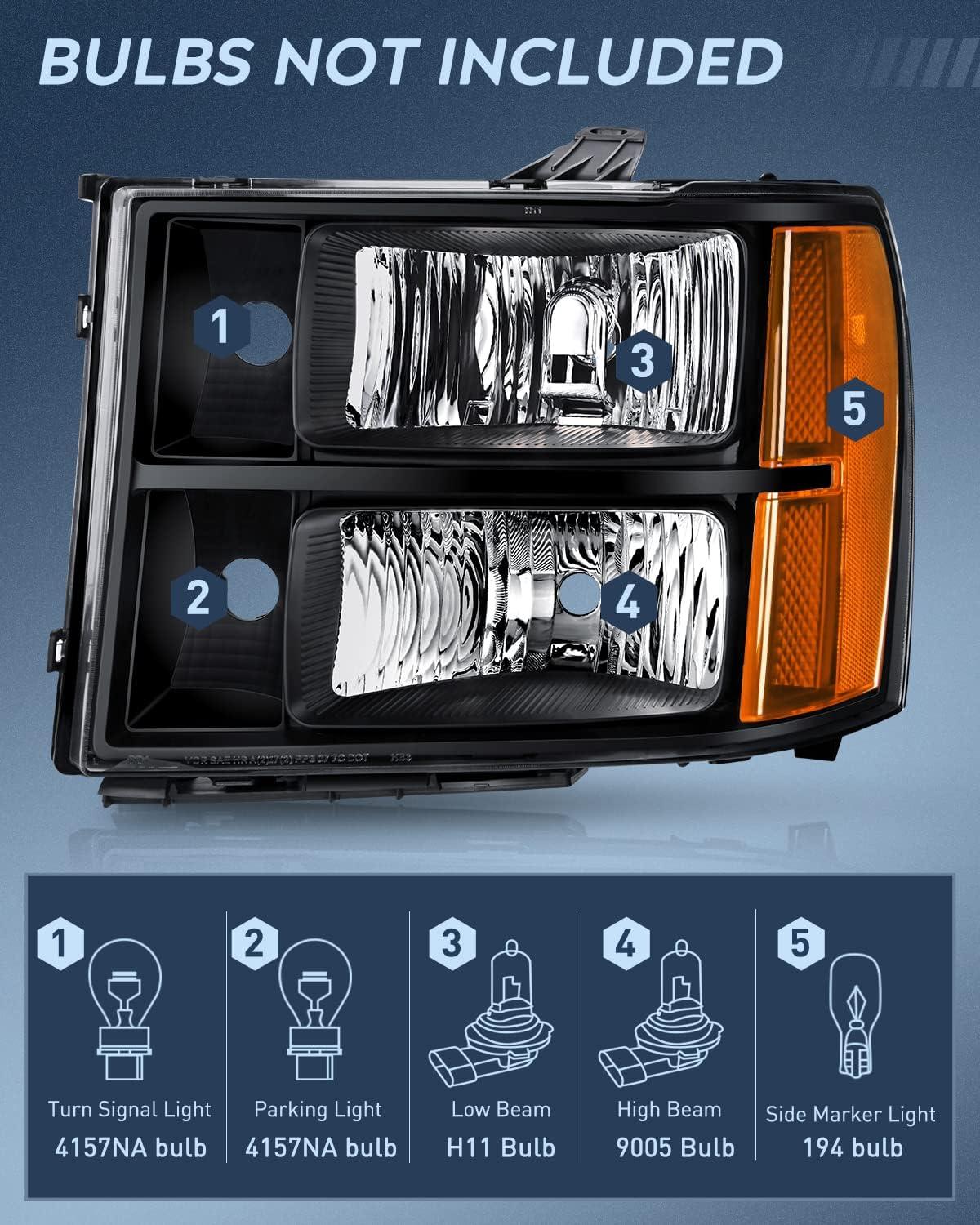 Nilight Headlight Assembly Compatible for 2007 2008-2013 GMC Sierra 1500 2008-2014 GMC Sierra 2500 HD 3500 HD Chrome Housing Amber Corner Clear Lens, Headlights Assembly Replacement(Black Housing + Amber Reflector)