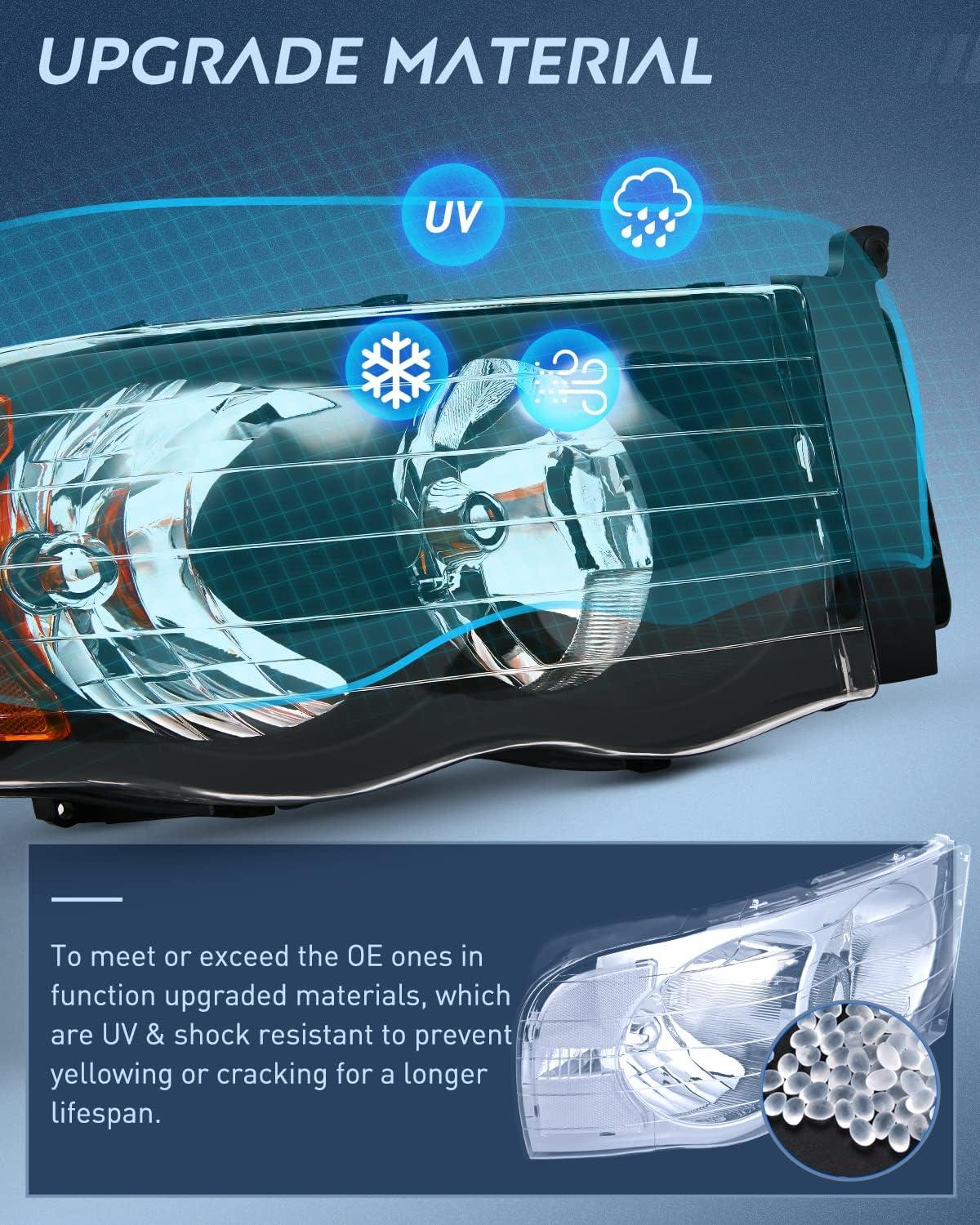 Safe Drive: Our 2002 2003 2004 2005 Ram 1500 2500 3500 headlights provide clearer and longer vision for driver to see the deer, wild animals, falling rocks or other obstacles at night in advance to reduce the possibility of danger.