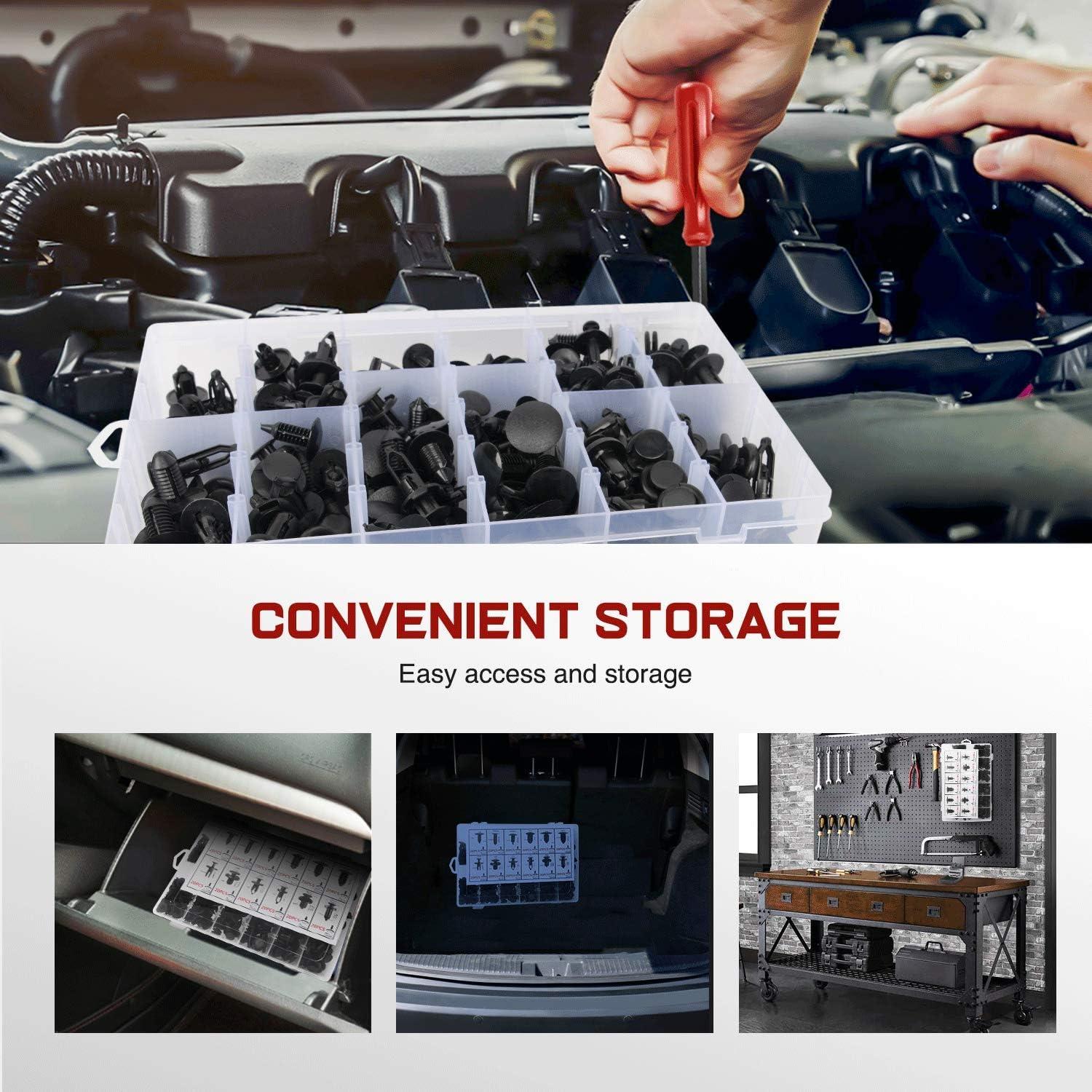 Packaging Includes: 1/4″ (6.4mm) hole size; panel range: .095″-.540″ – Nylon Shield Retainers –Qty: 20 9/32″ (7.1mm) hole size; panel range: .125″-.310″ – Nylon Shield Retainers — Qty: 20 5/16″ (7.8mm) hole size; panel range: .078″-.490″ -Black Shield Retainers –Qty: 20 23/64″ (9mm) hole size; panel range: .060″-.510″ – Black Shield Retainers –Qty: 20 3/8″ (9.5mm) hole size; panel range: .115″-.565″ -Black Shield Retainers –Qty: 20 25/64″ (10mm) hole size; panel range: .040″-.787″ -Black Shield Retainers –Qty: 20 1/4″ (6.3mm) hole size; panel range: 9/16″ – Black Mud Skirt Blind Rivets – Qty: 20 5/16″ (8mm) hole size; Head diameter: 20mm,Stem length: 11mm – Front fender push-type retainers – Qty: 20 5/16″ (8mm) hole size; head diameter: 20mm – stem length: 20mm -Air baffle to under carriage push-type retainers – Qty: 20 23/64″ (9mm) hole size; head diameter: 18mm – stem length: 28mm – Rear bumper cover push-type retainers – Qty: 20 23/64″ (10mm) hole size; head diameter: 20mm – stem length: 13mm – Push-type retainers – Qty: 20 23/64″ (10mm) hole size; head diameter: 20mm – stem length: 18mm – Push-type retainers – Qty: 20 Fits GM,Ford,Toyota,Honda, Acura