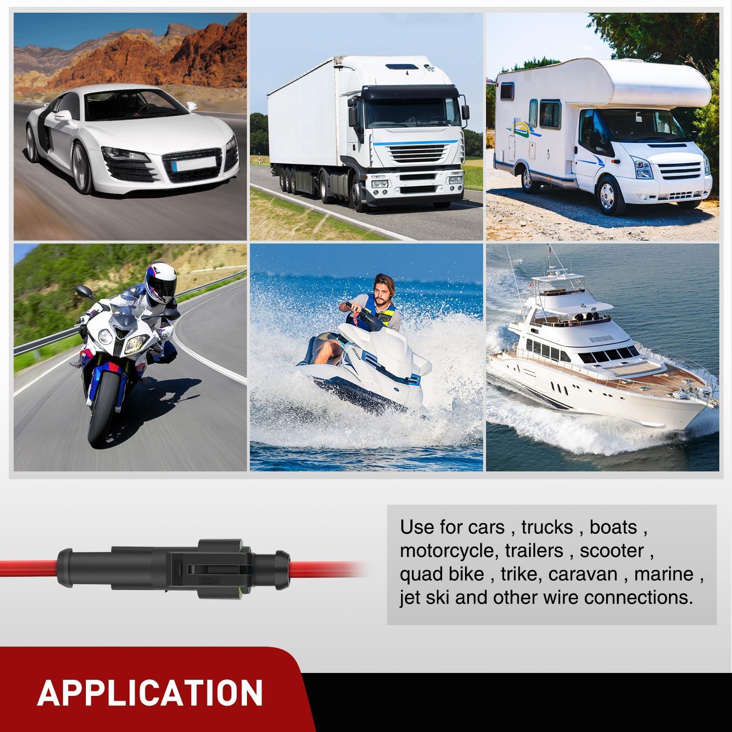 Application: Widely used for Motorcycles, Scooters, Cars, Trucks, Quad bikes, Trikes, Caravans, Marine Boats RVs etc. Great for connecting LED light bar, LED strips, LED wall-washers, LED underground light, LED belt light, curtain light, twinkle light and so on.