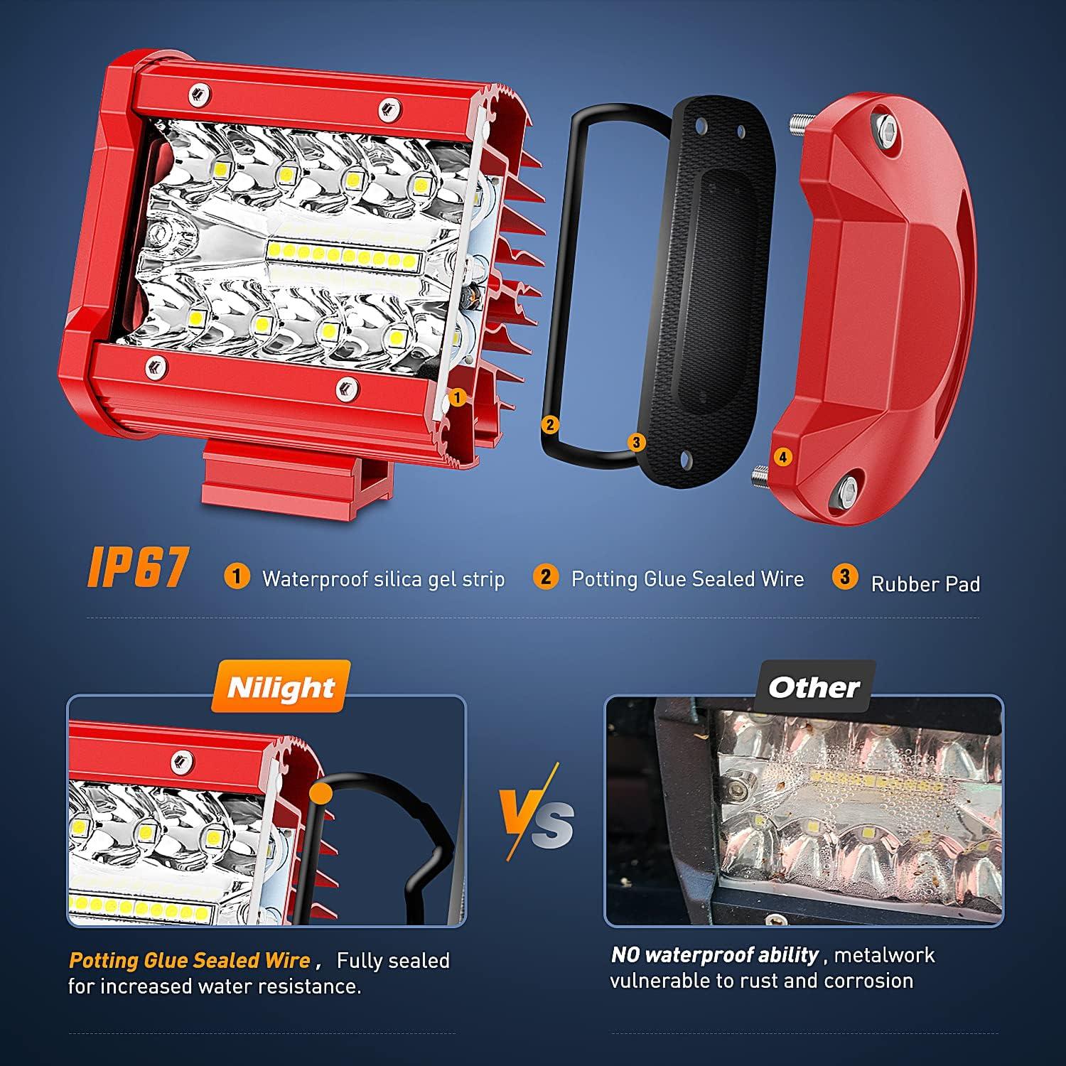 Nilight 2PCS 4Inch 60W LED Pods Spot Flood Amber White Light Bar Strobe 6 Modes Memory Function Off-Road Truck Car ATV SUV Cabin Boat with 16AWG Wiring Harness Kit-2 Lead, 2 Years Warranty(White Light with Red Shell)