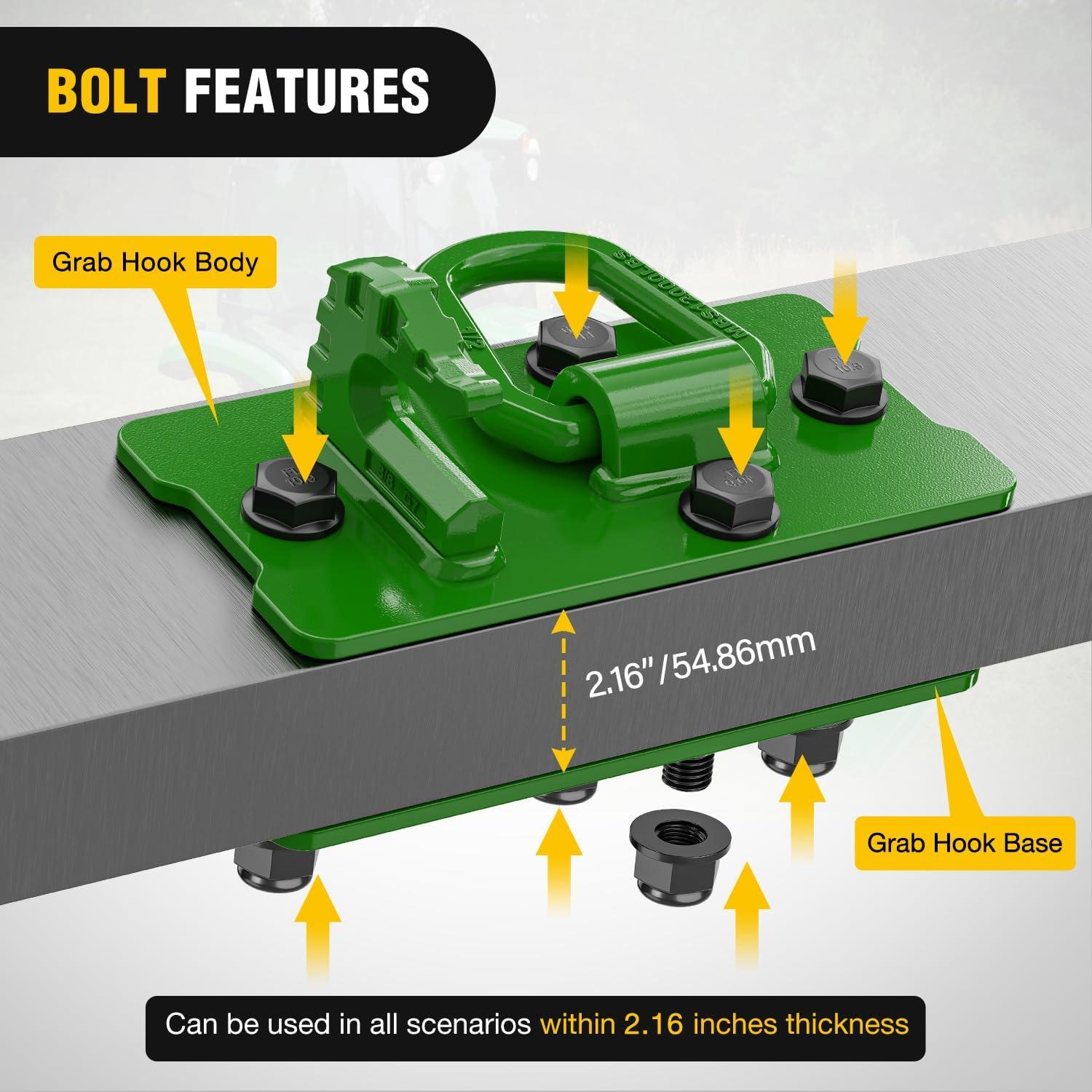 【Easy Installation】-Bolt-on Grab Hook coming with complete hardware for Installation, you can fix the grab hook on your machine with grade 10.9 locking bolts and lock anti-skid nuts easily.