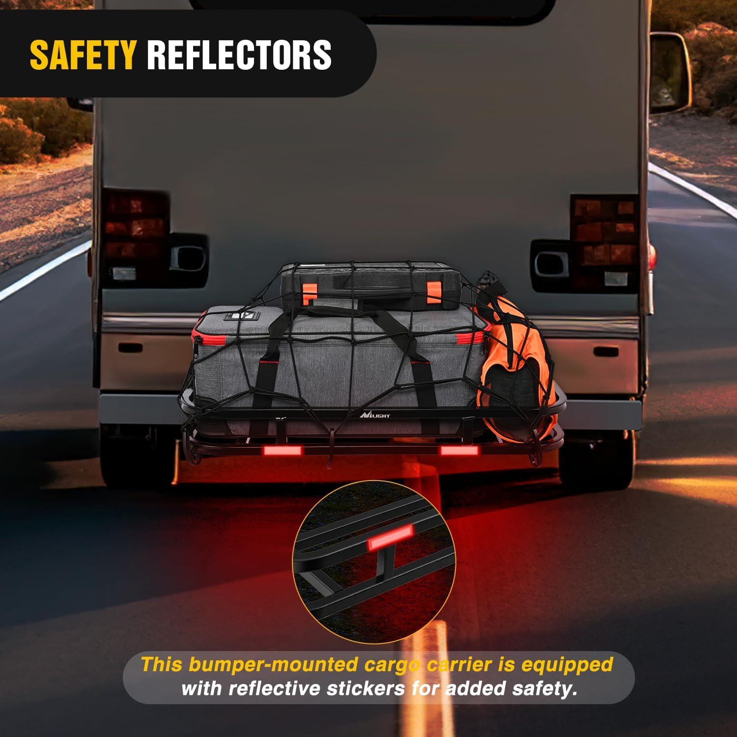 【Enhanced Security】This bumper-mounted cargo carrier is equipped with 4 different size reflective stickers for added safety.