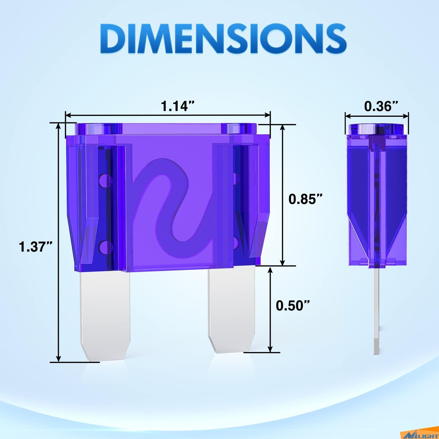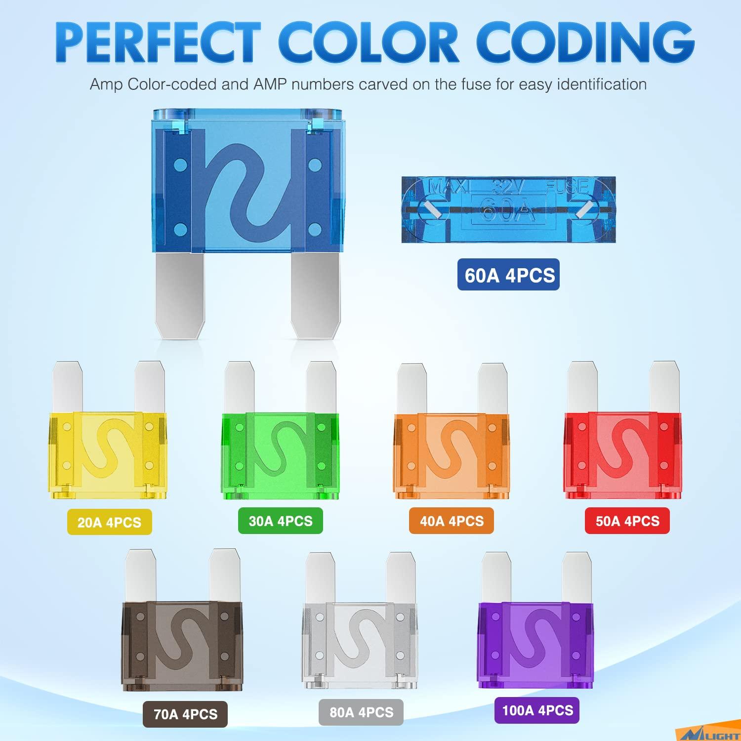 Easy Identification: Each fuses are color-coded on the plastic housing, and the carved amp rating (2A/5A/ 7.5A/ 10A/ 15A/ 20A/ 25A/ 30A/35A) are figures on the top of the fuses for easy identification.