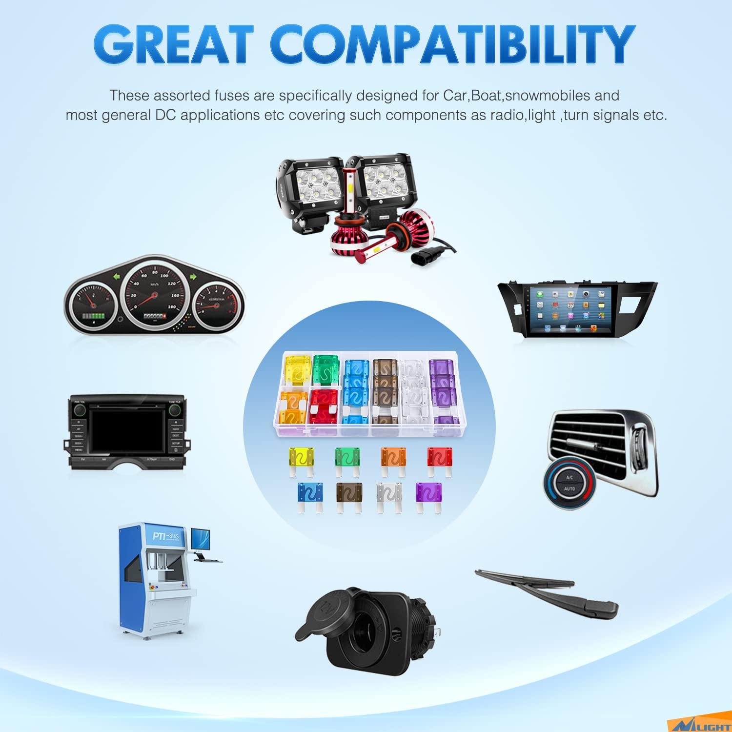 4 Types of Blade Fuses: This assortment kit covers Standard, Mini, Low Profile Mini, and Micro2 Fuses, they are commonly used in most of vehicles such as Cars, Trucks, SUVs, ATVs, UTVs, Campers, RVs, Motorcycles, etc. This set is the best one to get if you are unsure what size fuses you should get for your car or if you have multiple cars.
