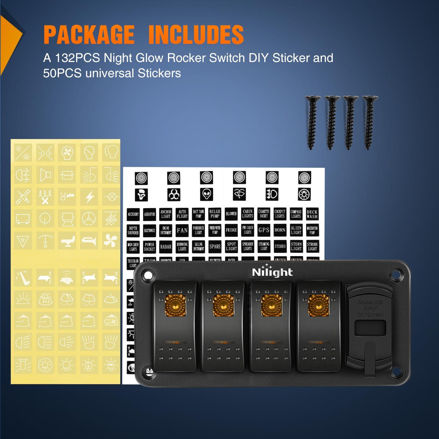 Wide Application: The switches allows you to control up to 4 different devices,such as Led Light Bars, Rear Lights, Rock Lights, Windshield Lights,Off road Lights, Sasquatch Lights, Zombie lights and Wench power, etc. The complimentary transparent and night glow stickers enables you to DIY the switch according to your preference.