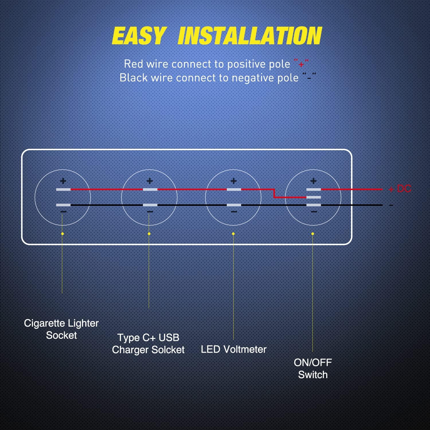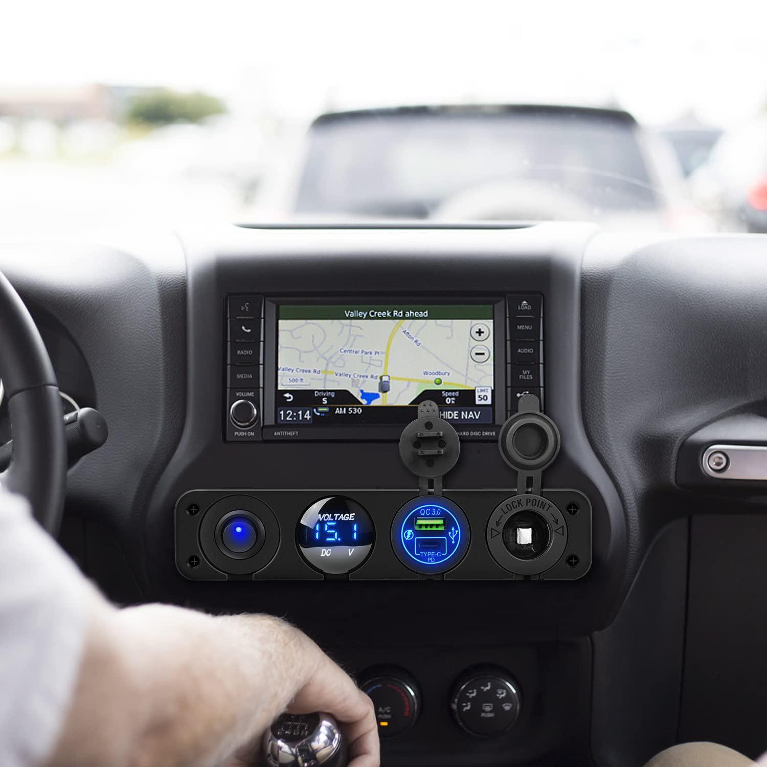 4 in 1 DIY Toggle Switch Panel: PD Type C and QC 3.0 USB Socket + Voltmeter + 12V Outlet + ON/OFF Toggle Switch. It’s convenient for installing and operating. Also detachable to replace other charger sockets or anything else that fits.