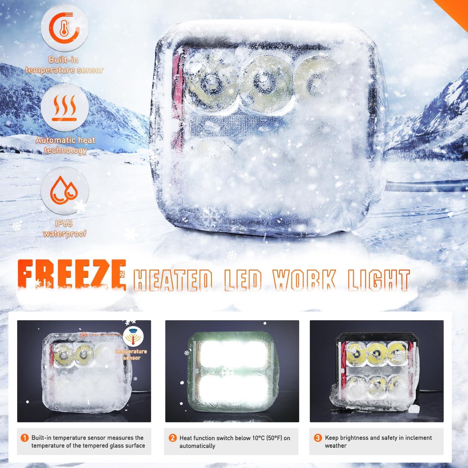 【Anti Freeze/Anti Icing Function】The lens is made of tempered glass, the built-in temperature sensor measures the temperature of the tempered glass surface. When the temperature is lower than 10°C (50°F), it will automatically turn on the heating function, which can melt the ice and snow on the surface of the work light to maintain brightness and safety in harsh weather