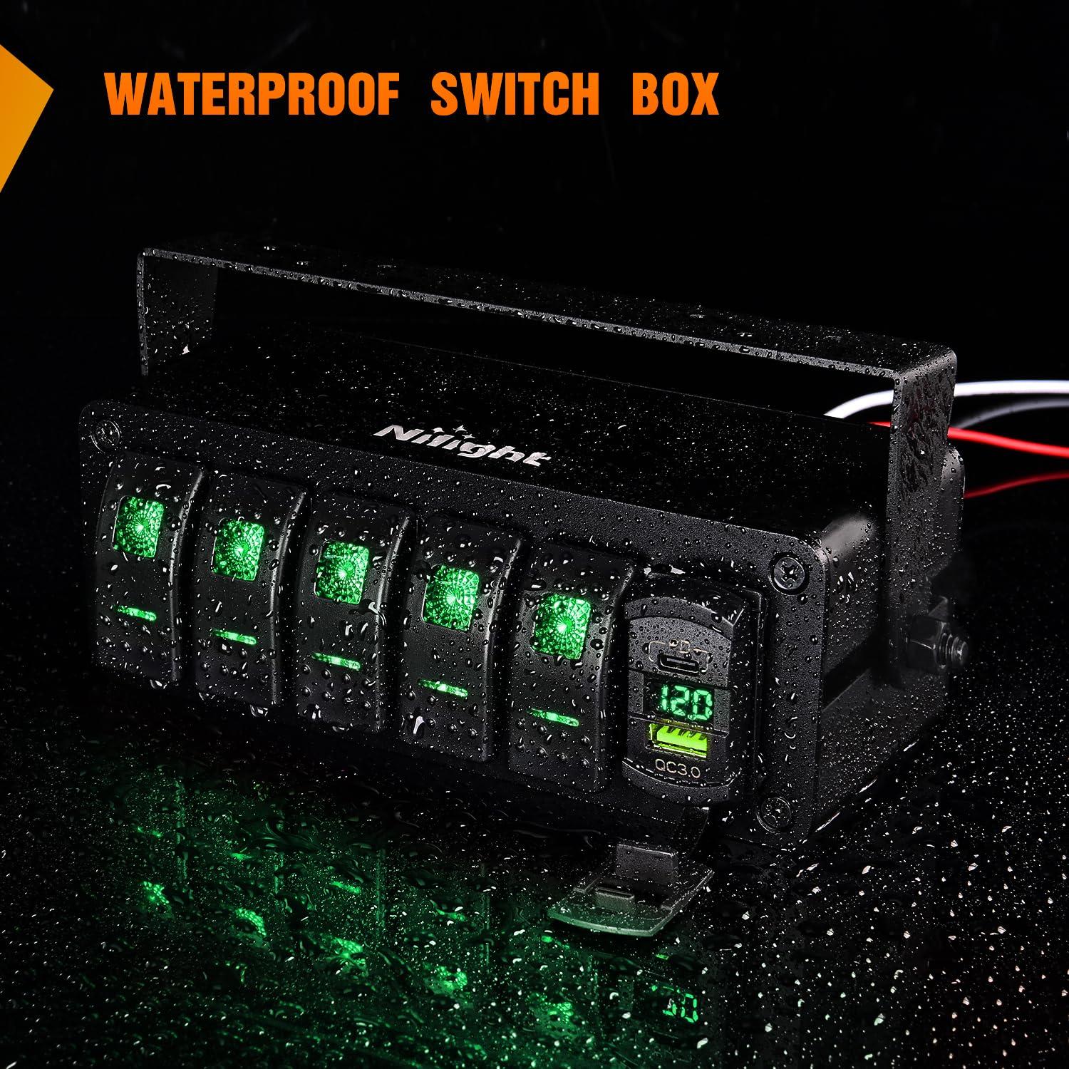 Nilight 5 Gang Rocker Switch Box 12V SPST ON Off Switches PD Type C and QC 3.0 USB Charger Voltmeter Waterproof Aluminum Panel DIY Stickers for Boats Cars RVs Trucks(Green+Box)