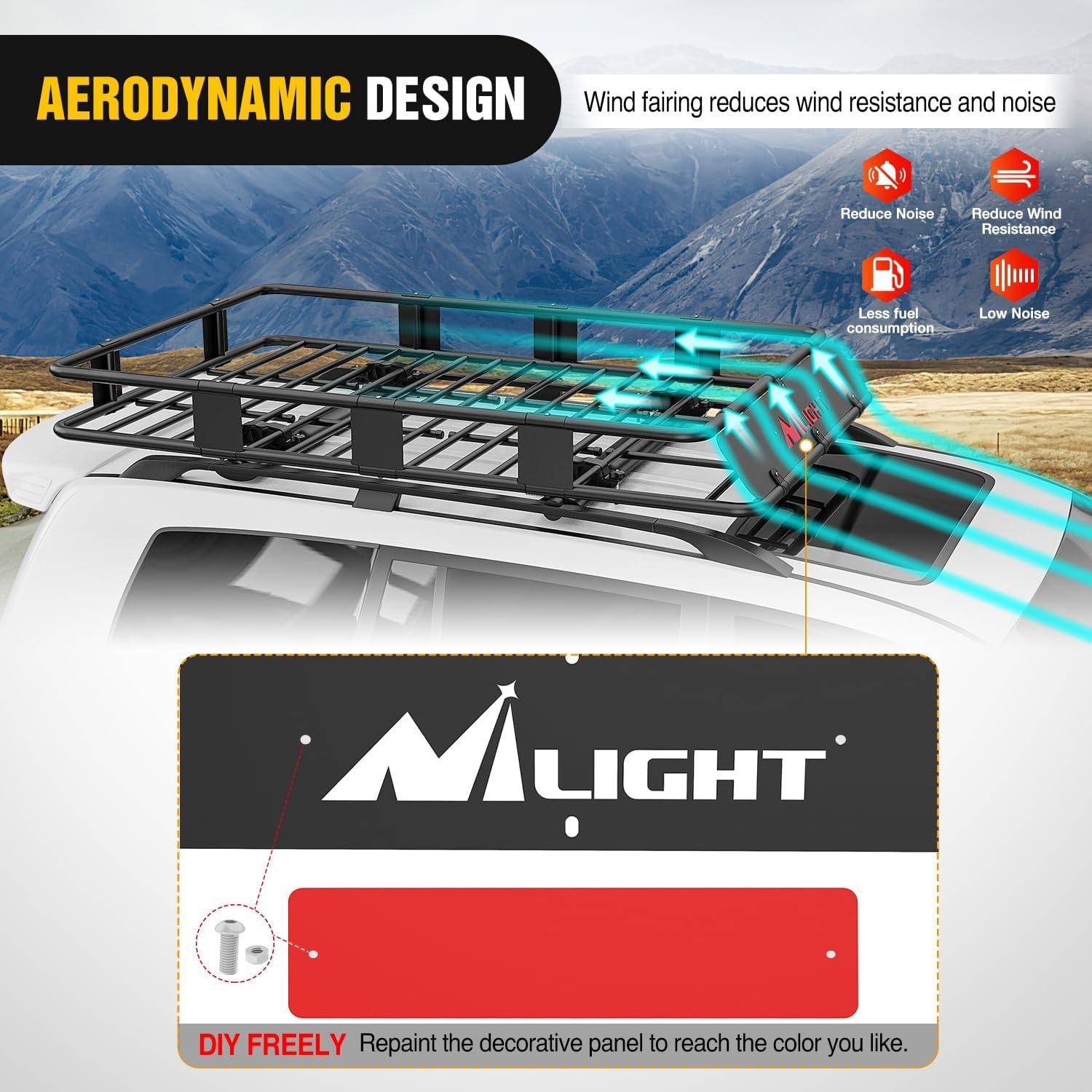 【AERODYNAMIC DESIGN】- The front of the roof cargo rack is equipped with a wind fairing to reduce resistance and wind noise. The cargo basket is designed with a curved corner to avoid scratches and accidental injuries when loading and unloading cargo.