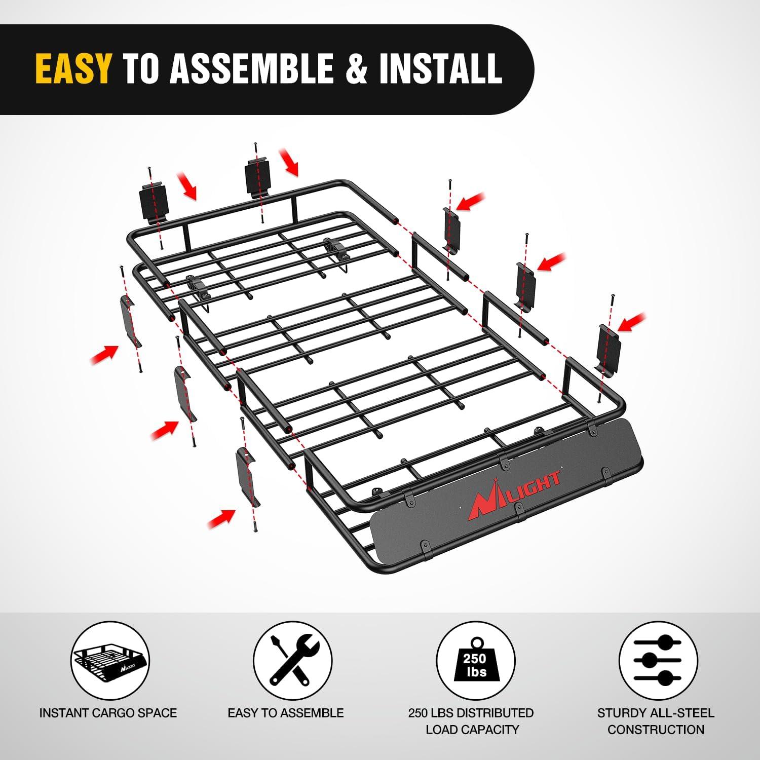 【DIMENSION AND LOAD CAPACITY】- Nilight 51″ x 36″ x 5″ Universal Roof Rack Cargo Basket. With a 200 lb capacity and extendable design, our cargo rooftop carrier easily attaches to any vehicle with cross bars. This vehicle roof cargo basket will work well with any vehicle; a car, van,pickup truck, or SUV.