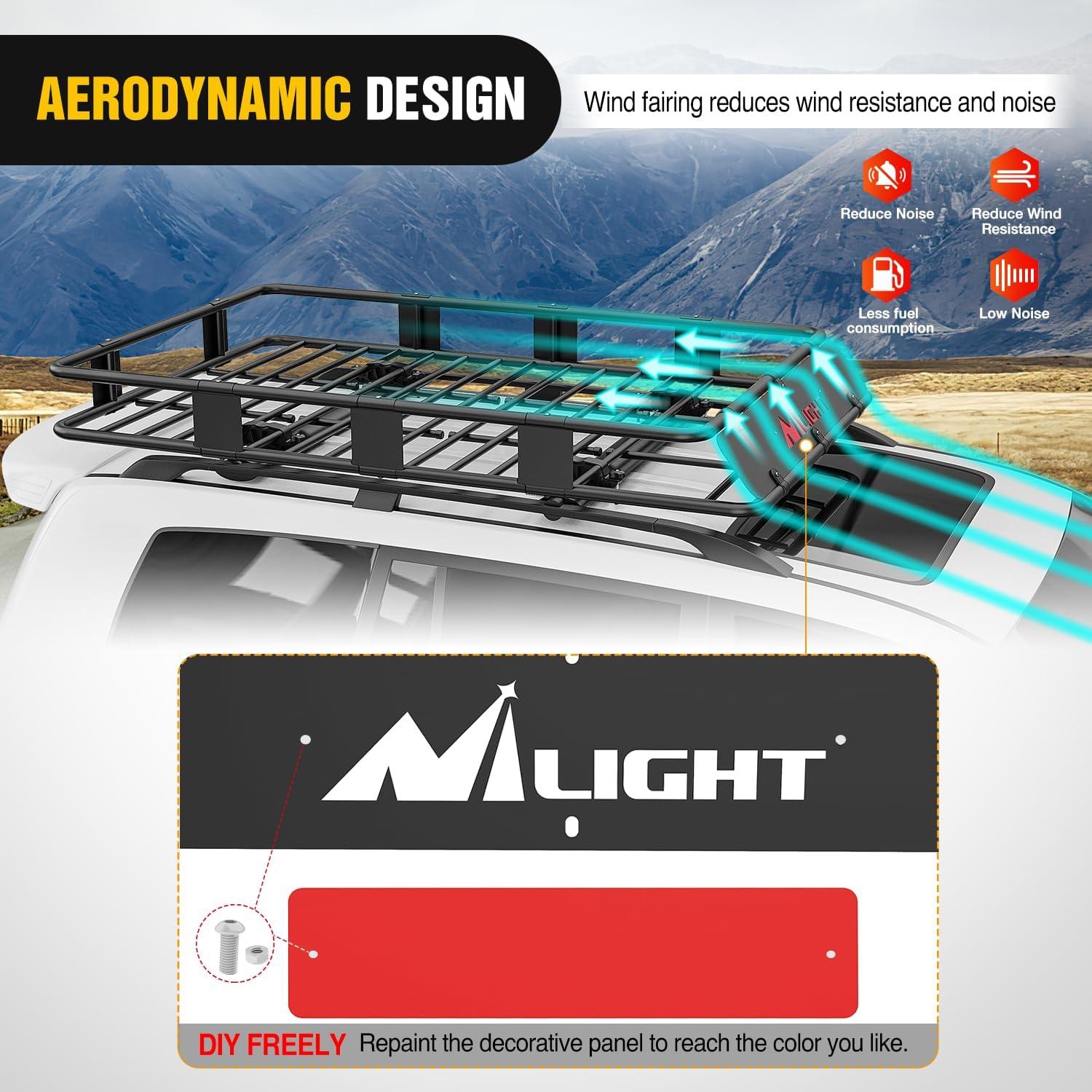 【AERODYNAMIC DESIGN】- The front of the roof cargo rack is equipped with a wind fairing to reduce resistance and wind noise. The cargo basket is designed with a curved corner to avoid scratches and accidental injuries when loading and unloading cargo.