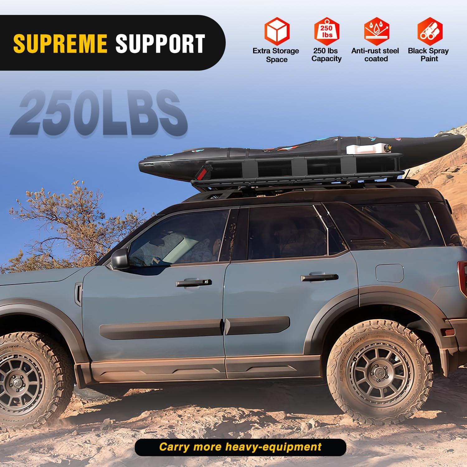 【UPGRADE DESIGN】- Instead of U-bolts, we use a rubber-clad metal strip design to better protect the roof bars from wear and rust. Durable powder-coated steel construction for long-lasting corrosion resistance. But it is still recommended to park your car indoors to keep your cargo rack rooftop in great shape for any future journeys.