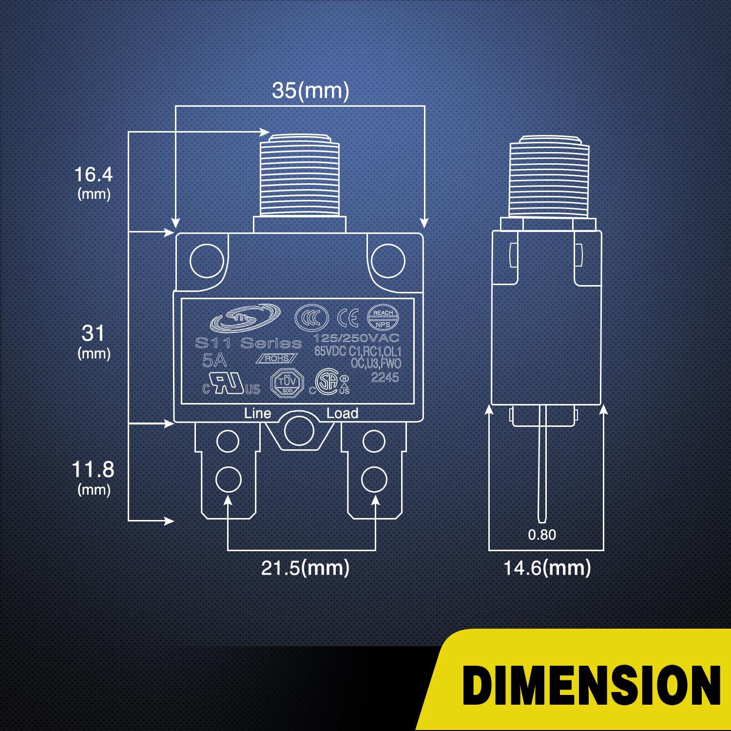 Compact Design: Push-to-reset operation with black manual reset button. This circuit breaker with a waterproof button cap to protect from moisture, water, or bad weather. The hole size for mounting is in 3/8 inch(10mm).This circuit breaker can be used for both AC and DC applications. It's for 125V/250V AC and 65V DC applications.