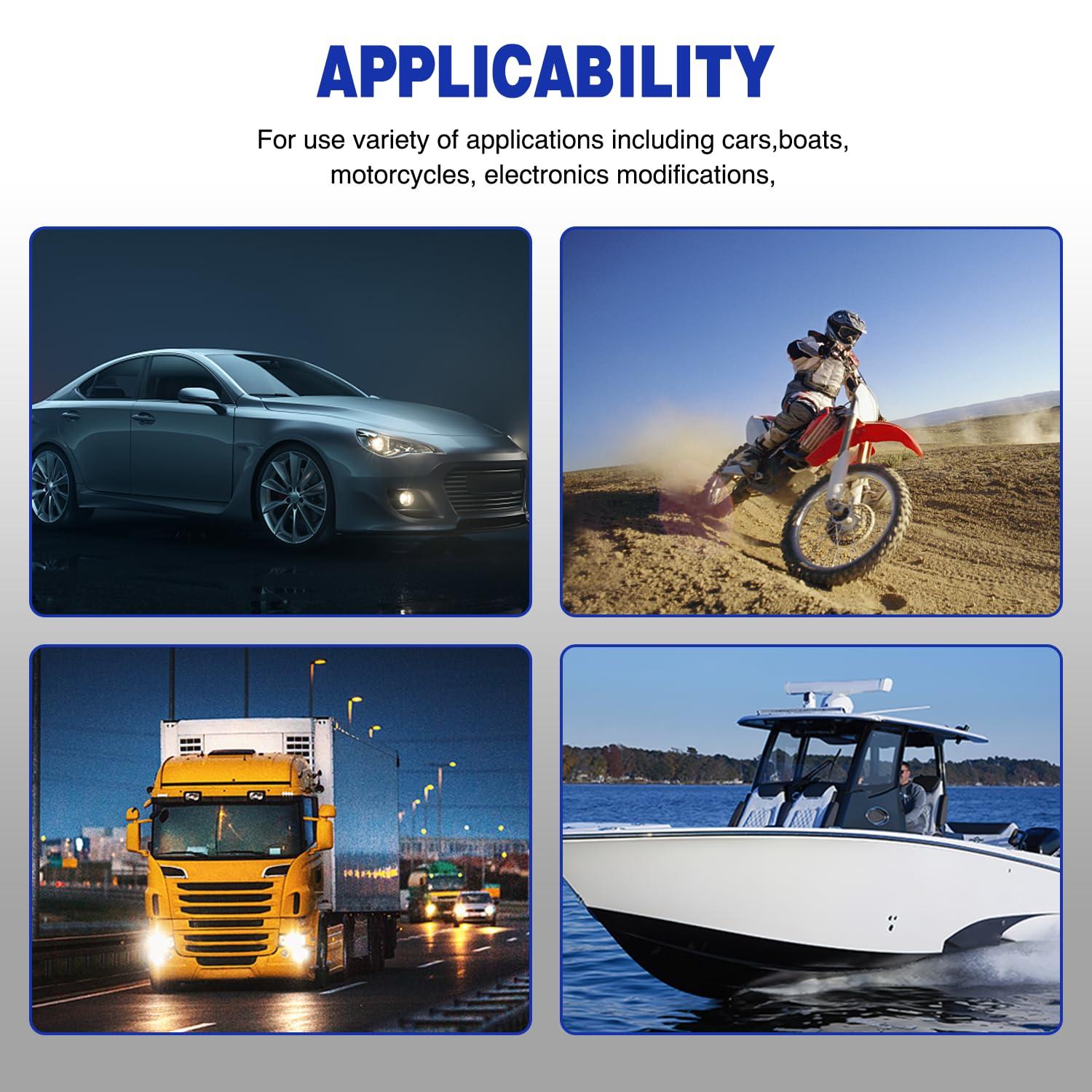 Wide Application: Suitable for installing in any 12V motorized vehicles such as cars, trucks, boats, atvs, utvs, RVs,motorhomes, racecars or any off road vehicles. Widely used for controlling LED lights, fog lights, underglow lights etc.