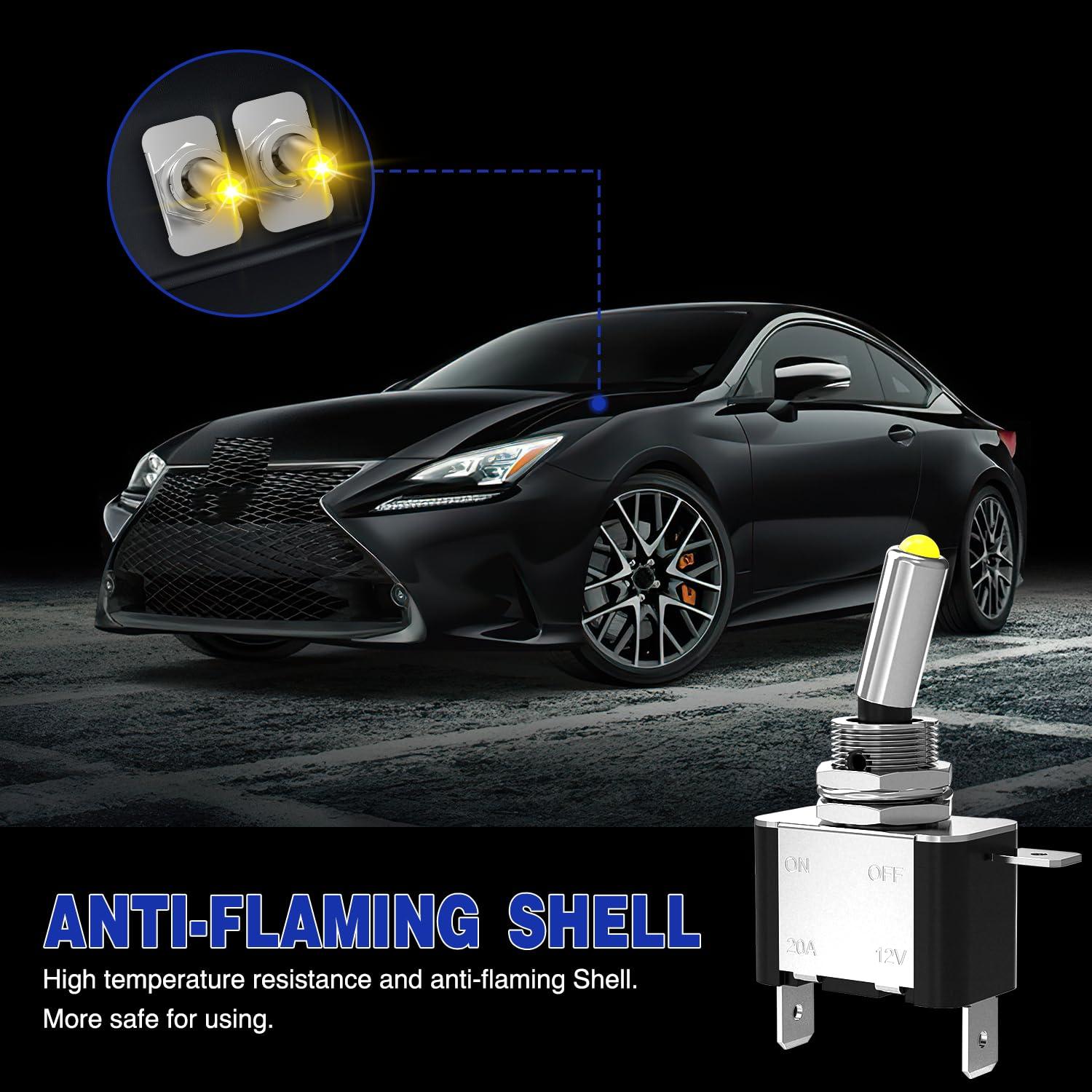 Function: Blue LED toggle switch with 3 pin blade type terminals, SPST design(single pole single throw), Rated at 20A 12V DC and designed with rocker style easy to turn on and off.