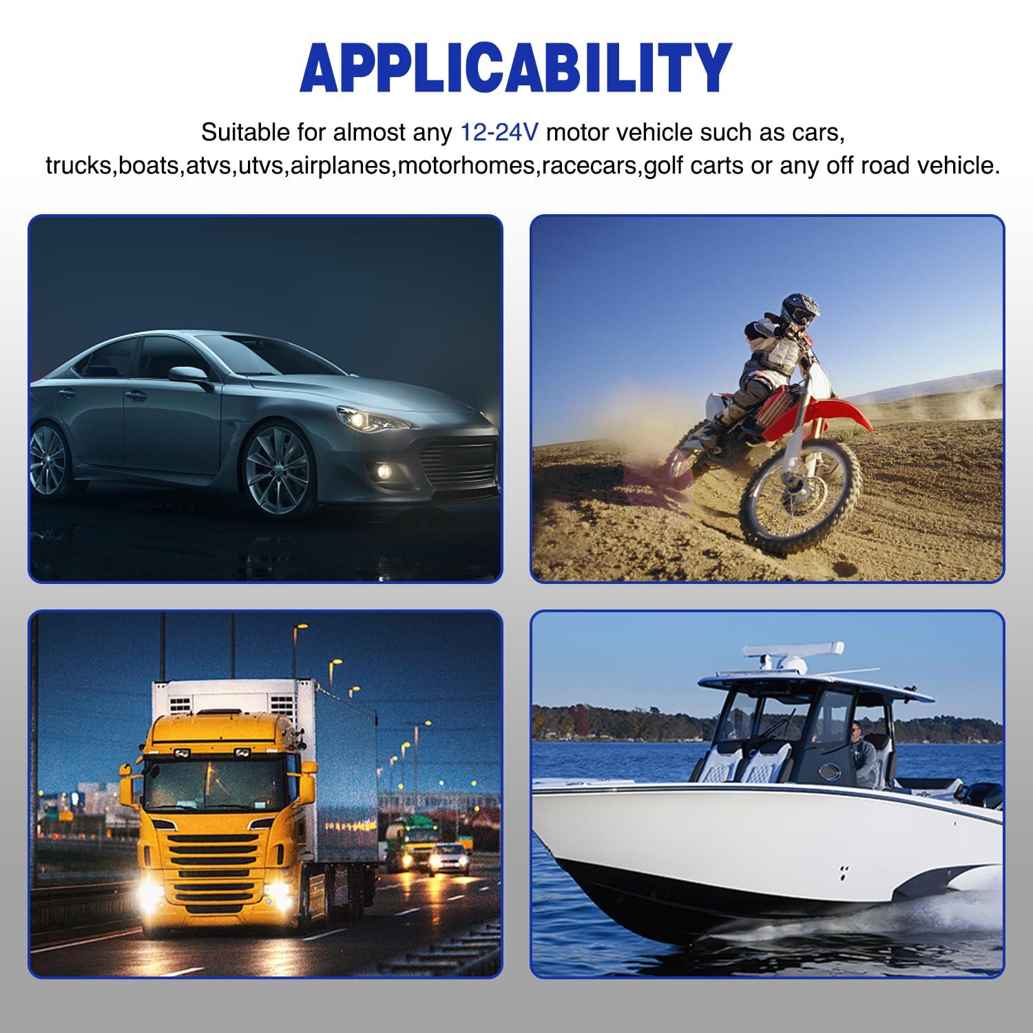 Wide Application: Suitable for any 12V motorized vehicles such as cars, trucks, boats, atvs, utvs, RVs,motorhomes, racecars or any off road vehicles.