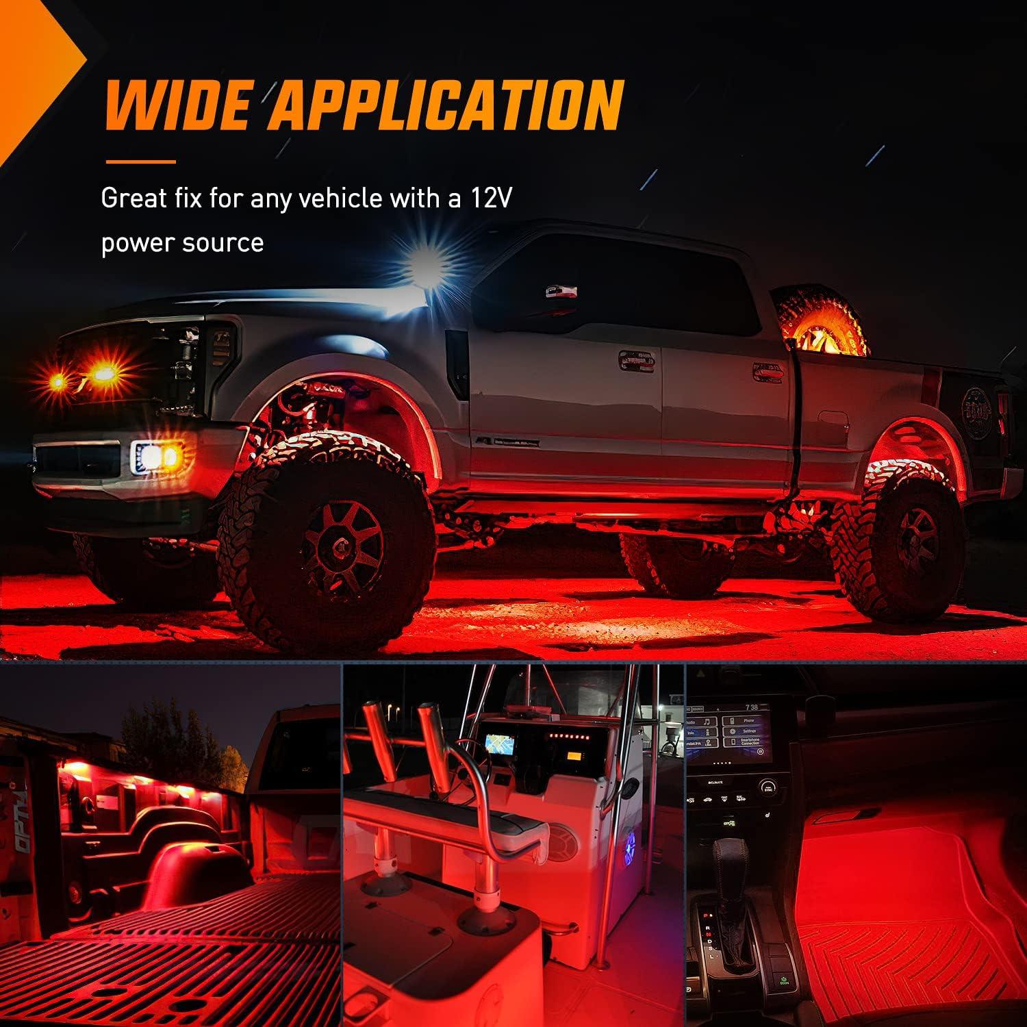 Application: It can be used in a variety of interior and exterior applications including Under Car, Underglow Footwells, Pickup Truck Beds, Rock Lights, Running boards, tonneau cover, etc. Compatible with most pickup such as ford, dodge ram, Chevrolet, toyota, trucks, RVs, SUVs, UTV, ATV, motorcycle, jeeps, boats, etc.