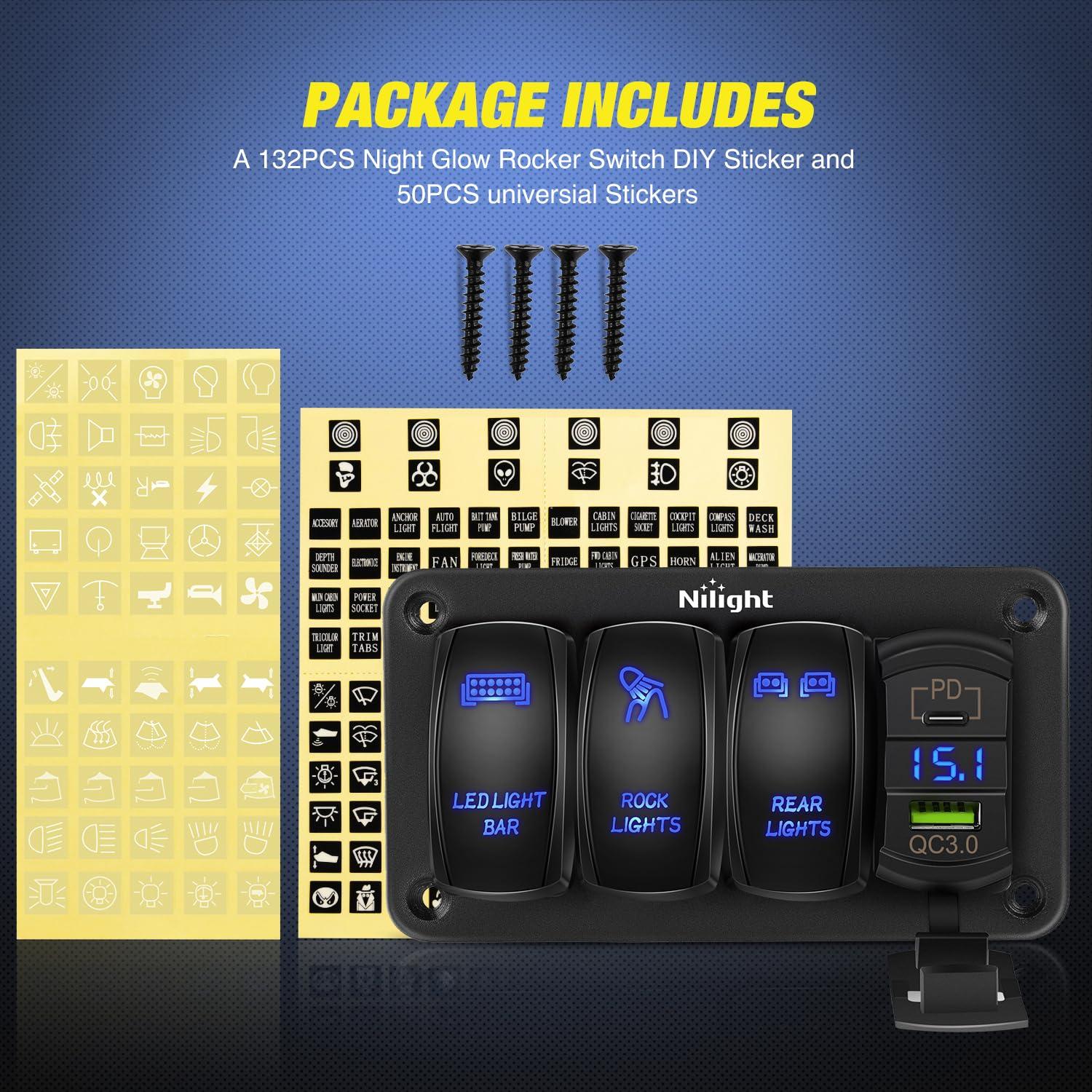 Nilight – 90105C 3 Gang Aluminum Rocker Switch Panel 5 Pin ON/Off Pre-Wired Toggle Switch Panel With Rocker Switch Holder 12/24V for Marine Boat Car ATV UTV, 2 Years Warranty,Blue(Type C +USB Blue)