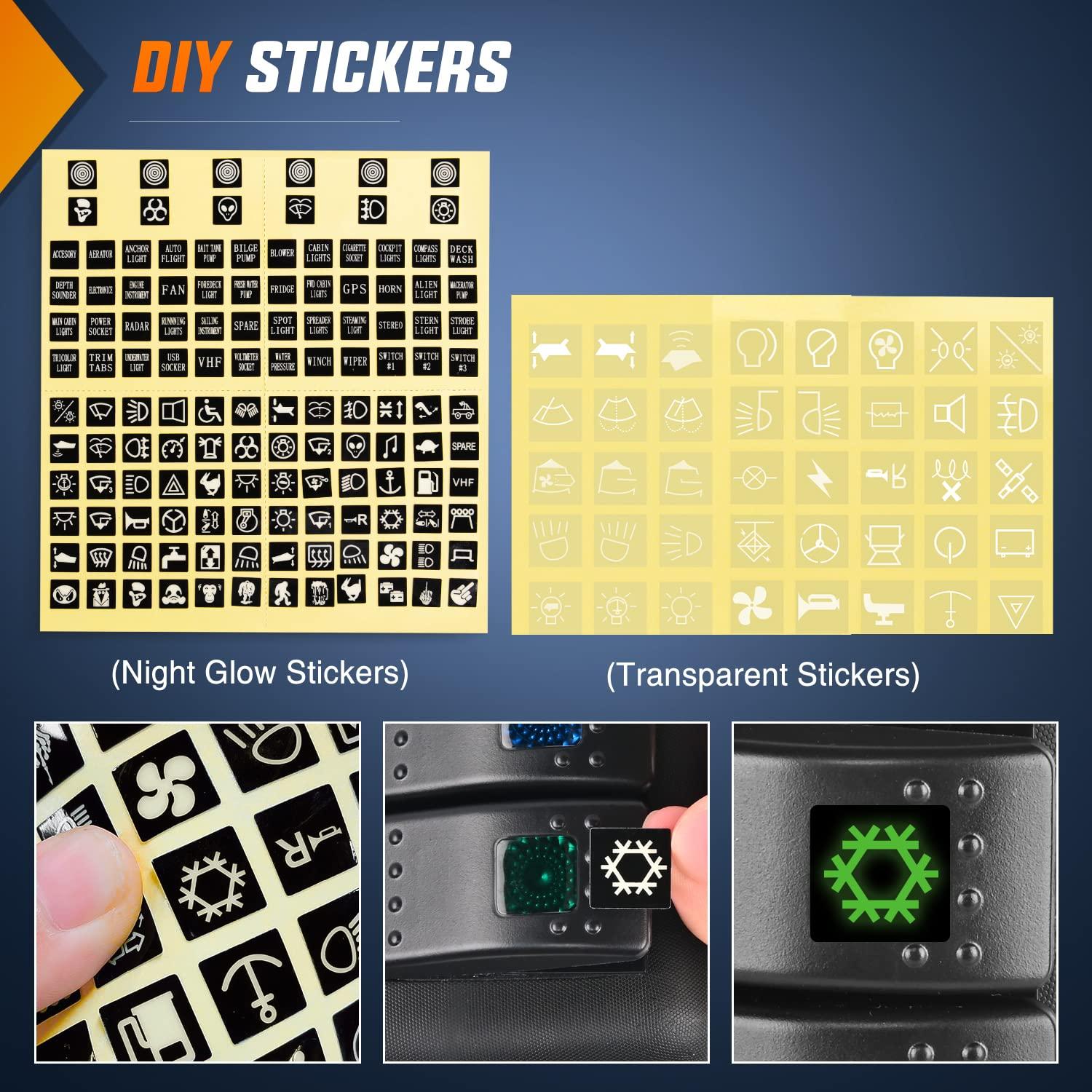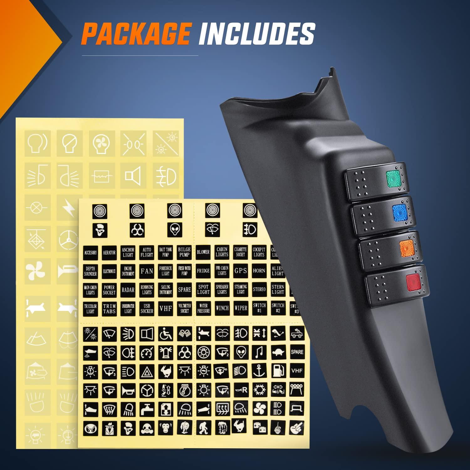 Package Included:1 x A-Pillar Switch Pod with Amber/Blue/Red/Green rocker switches, 2 sets of DIY stickers, and Instruction manuals.