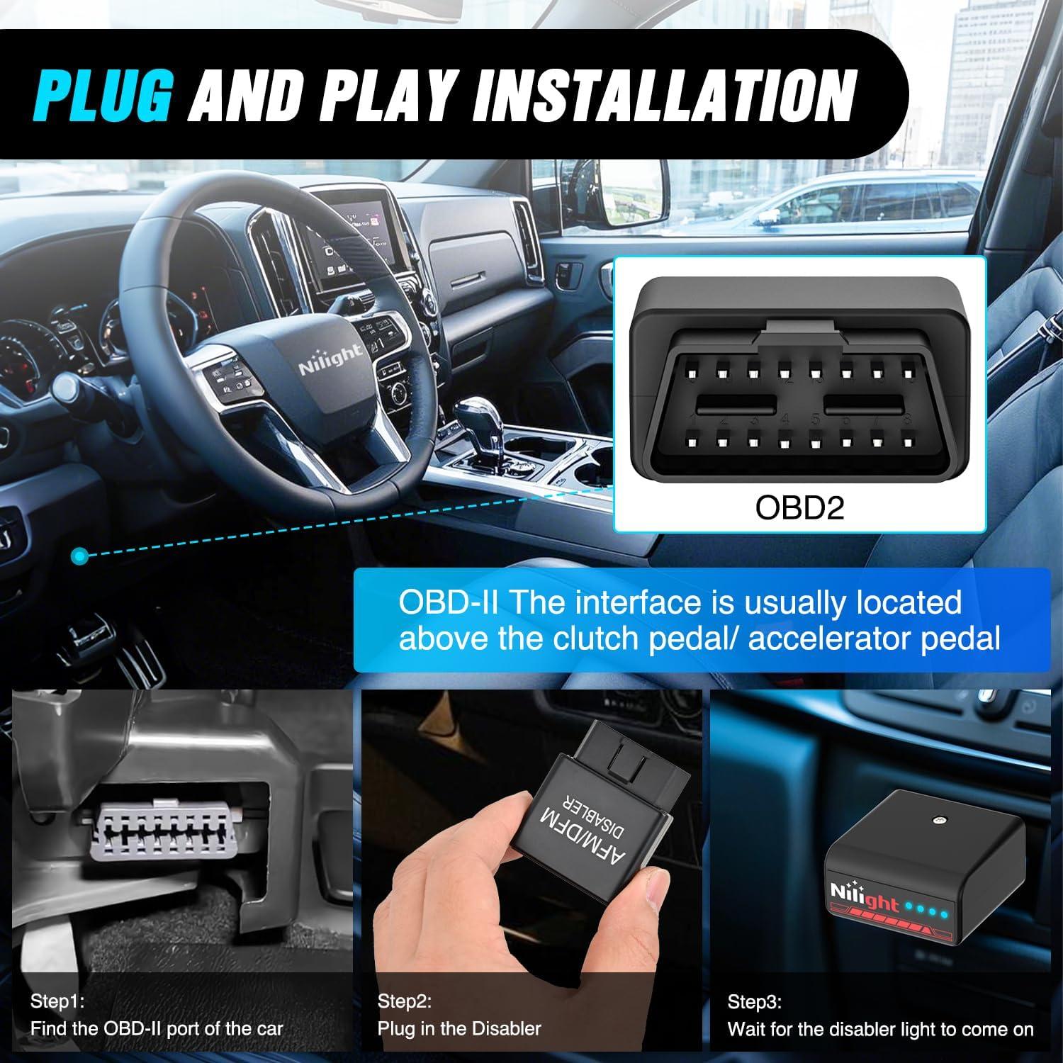 EASY PLUG AND PLAY INSTALLATION: No tools required. Simply plug the Disabler device into your vehicle's OBD-II port and the indicator lights will flash in sequence, settling into a steady four or two light display to signify a connected and operational status. If you need to stop using it, simply unplug it to uninstall it.(Unplug the AFM device if it will not be used for a long time)