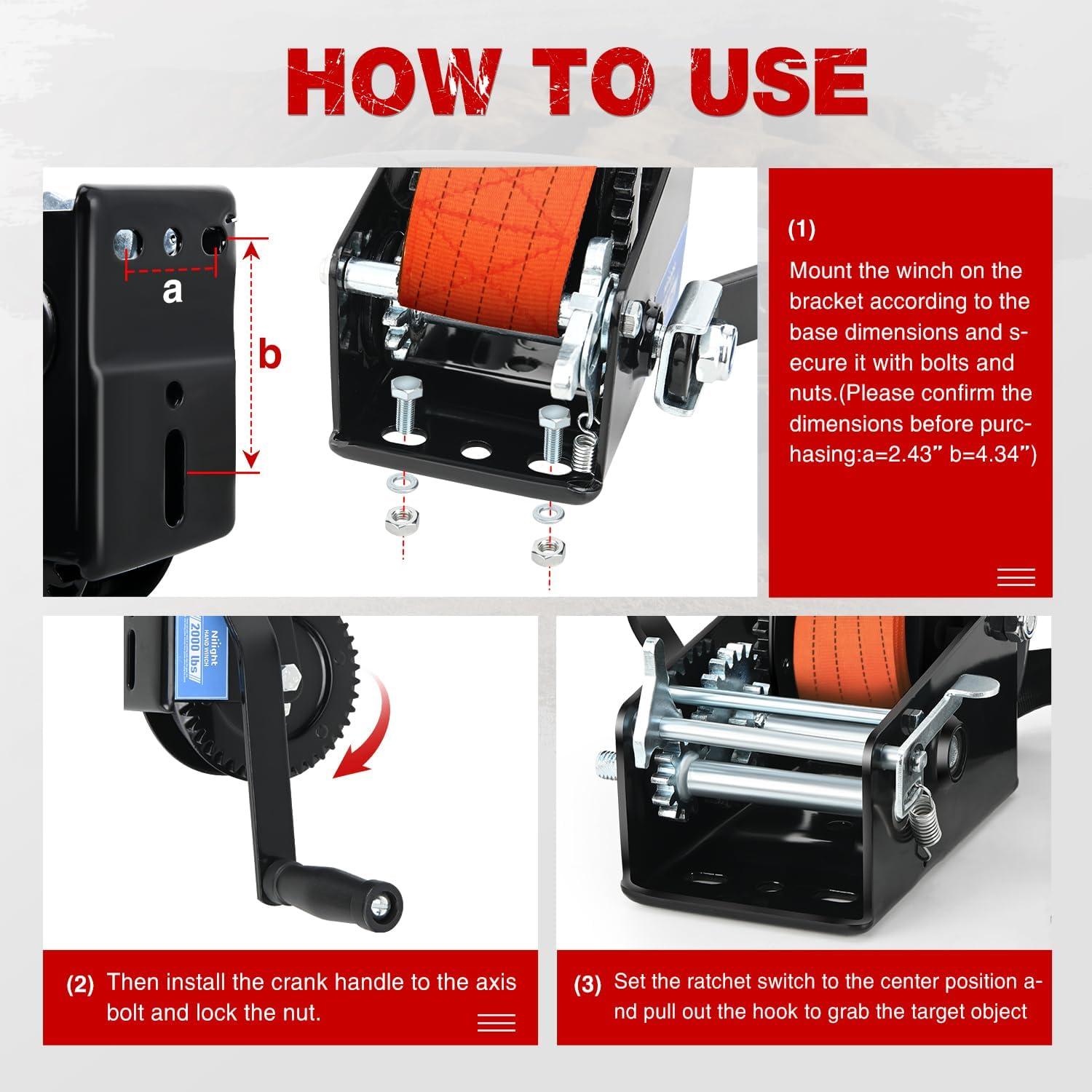 PACKAGE AND SERVICE: 1x 3500LBS boat hand winch with ratchet switch, 1x crank hand,1x winch hook, 1x 33ft orange polyester winch strap, mounting bolts, operation manual. If you have any questions, please feel free to contract us, we will do our best to help you solve your problem