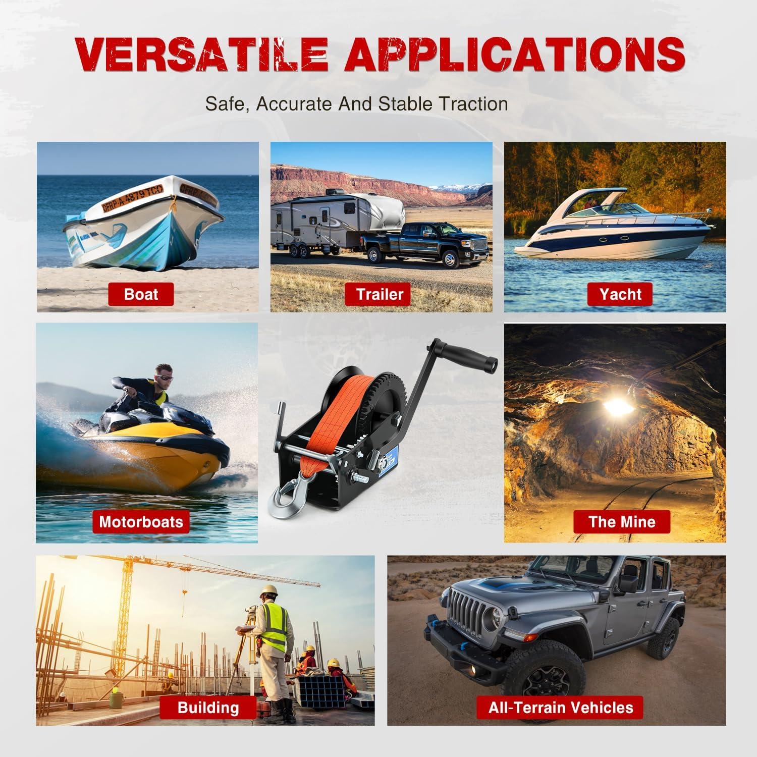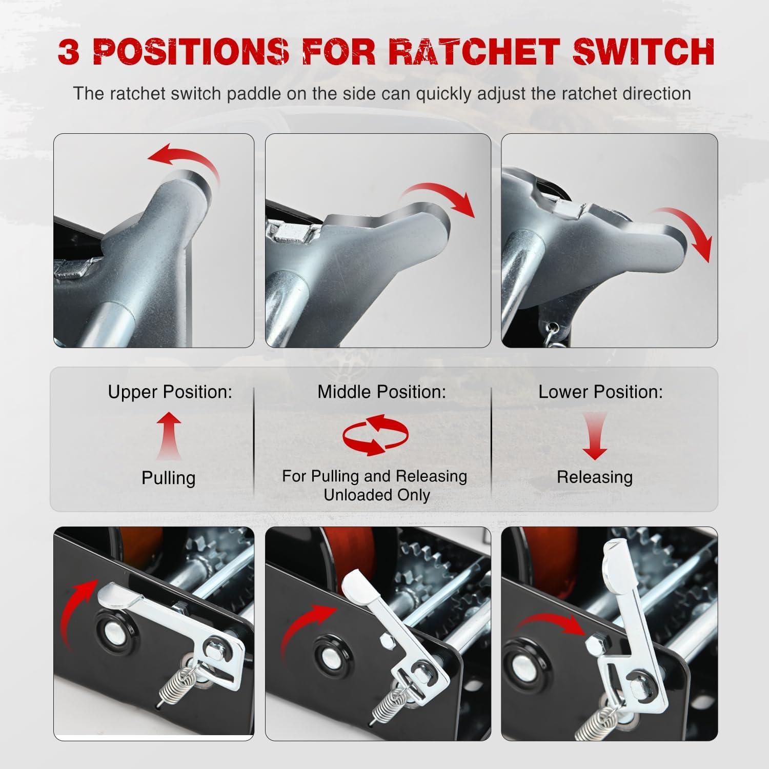 TWO-WAY RATCHET WINCH: The boat crank winches feature a top-notch carbon steel two way ratchet that ratchets forward and backward to provide you with operational flexibility. The two speed 4:1 and 8:1 gear ratios give you more options and faster ultra-easy towing. Making it the perfect outdoor boat trailer towing tool