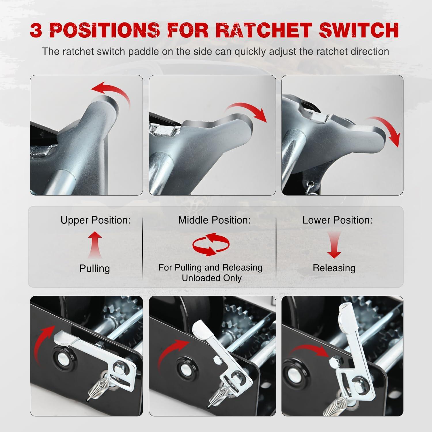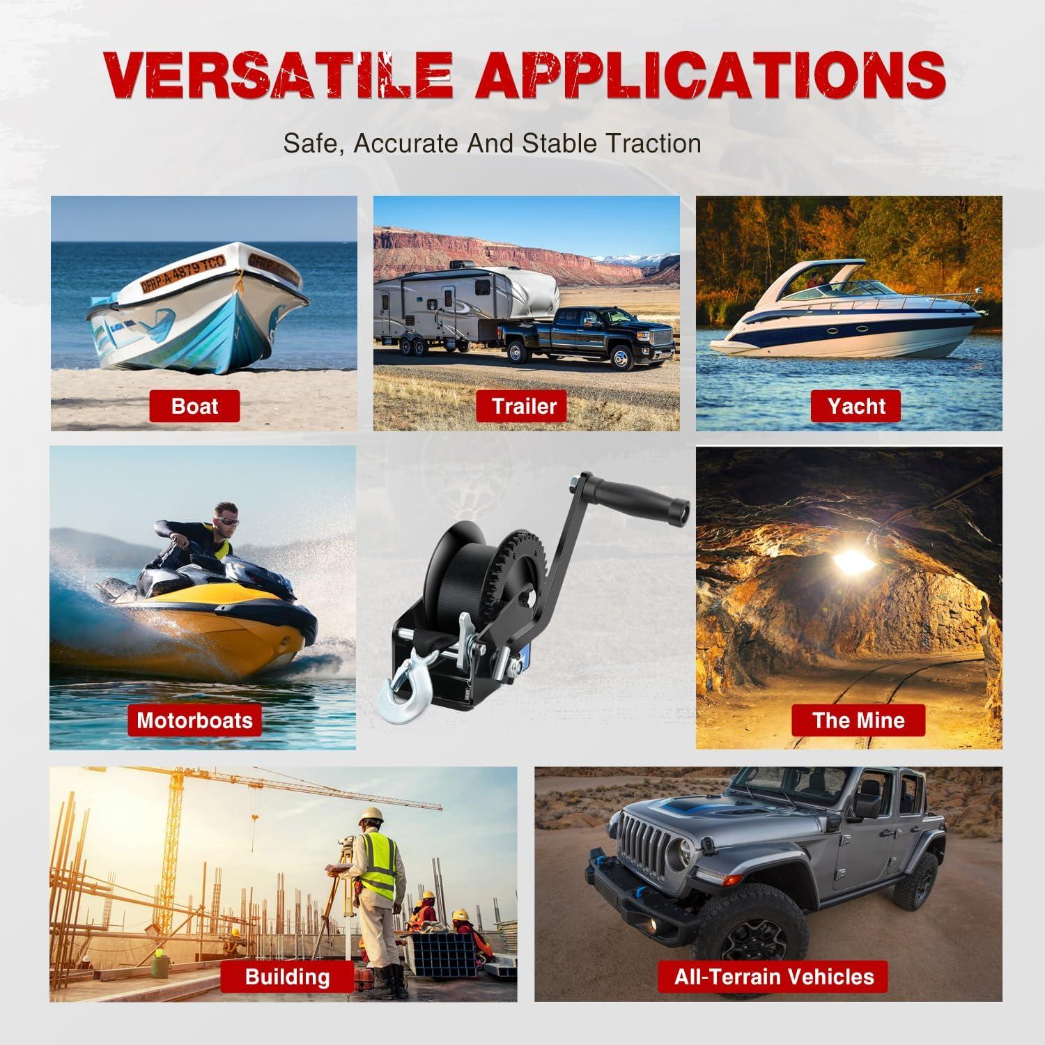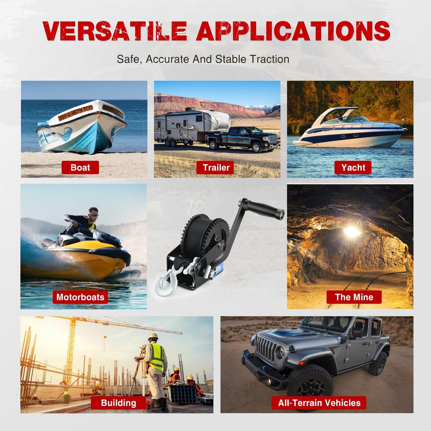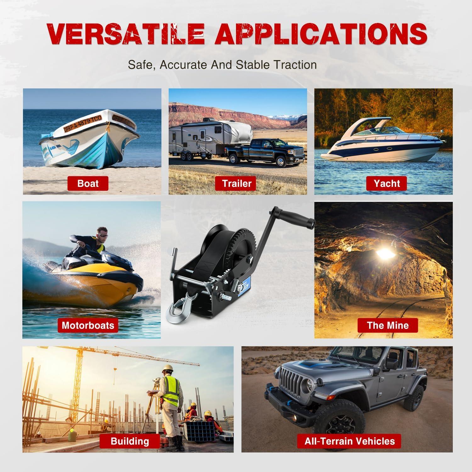 TWO-WAY RATCHET WINCH: The boat crank winches feature a top-notch carbon steel two way ratchet that ratchets forward and backward to provide you with operational flexibility. The two speed 4:1 and 8:1 gear ratios give you more options and faster ultra-easy towing. Making it the perfect outdoor boat trailer towing tool