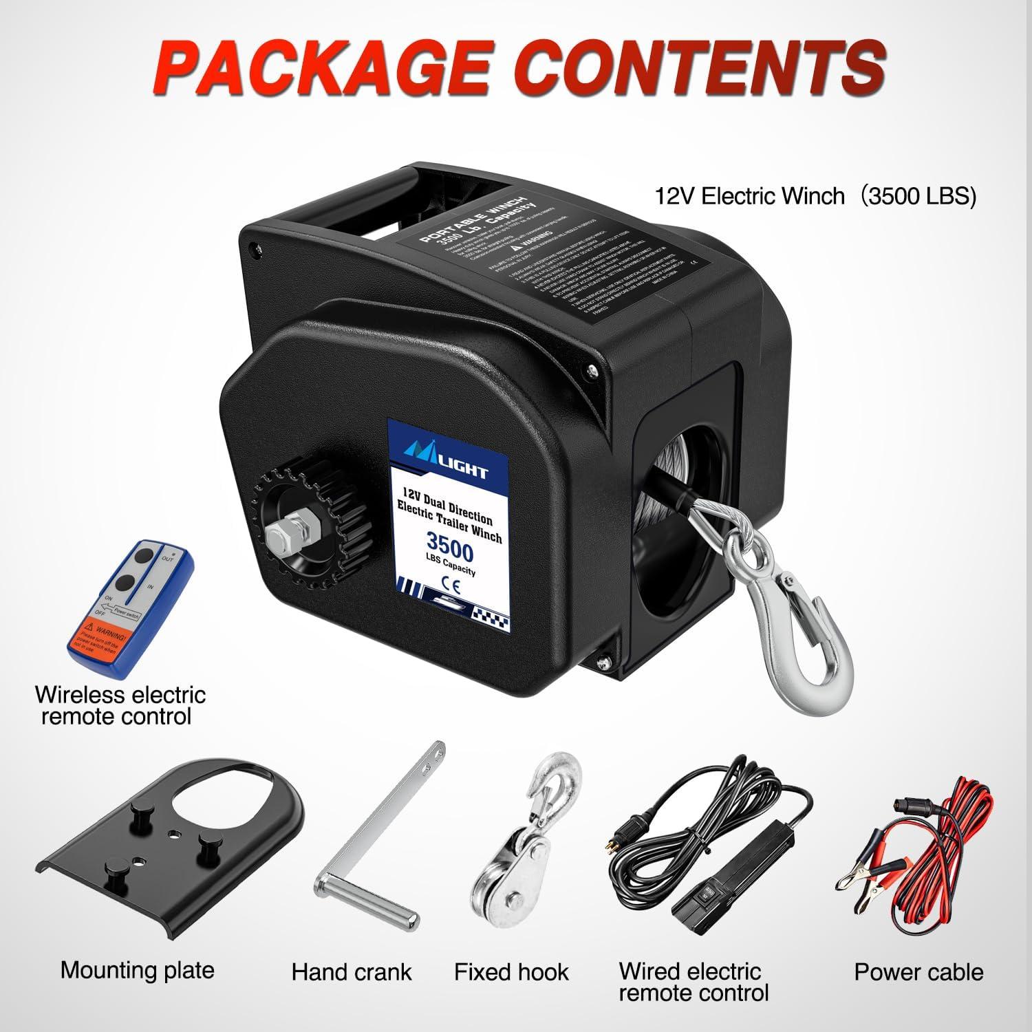 PACKAGE INCLUDS: 1x boat trailer winch (12v 3500 lbs), 2x electric remote control (wireless & wired) , 1x hand crank , 1x power cable , 1x mounting plate , 1x winch hook. If there is any quality problem with our electric winch, please feel free to contact us