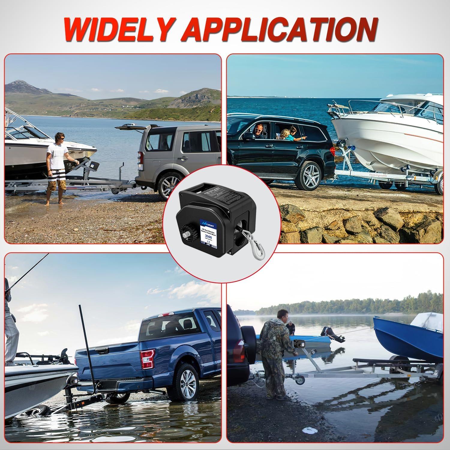 EFFICIENT ELECTRIC BOAT WINCH: The portable winch features a 265:1 gear reduction ratio and automatic braking system, a low-noise design for no ratchet noise during operation. Boat towing winch strong, quiet, reliable traction, allows for faster linear speeds while reducing amperage pull and ensures that the electric winch runs smoothly during operation