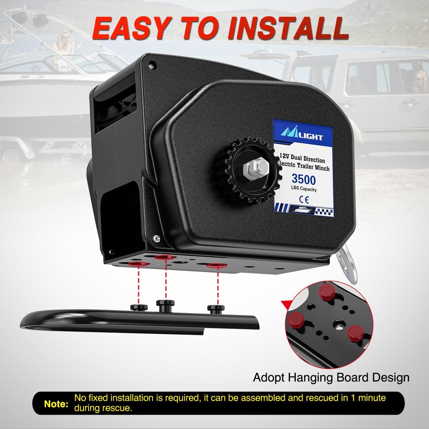 EASY & DURABLE: Boat trailer winch comes with 34ft/10.5m winch Galvanized steel cable and hook for additional safety. Tool-free, slide-on 2-inch hitch mounting plate for easy mounting to any 2-inch ball hitch receiver. Provides heavy duty winching power for boats, trailers and other loading jobs