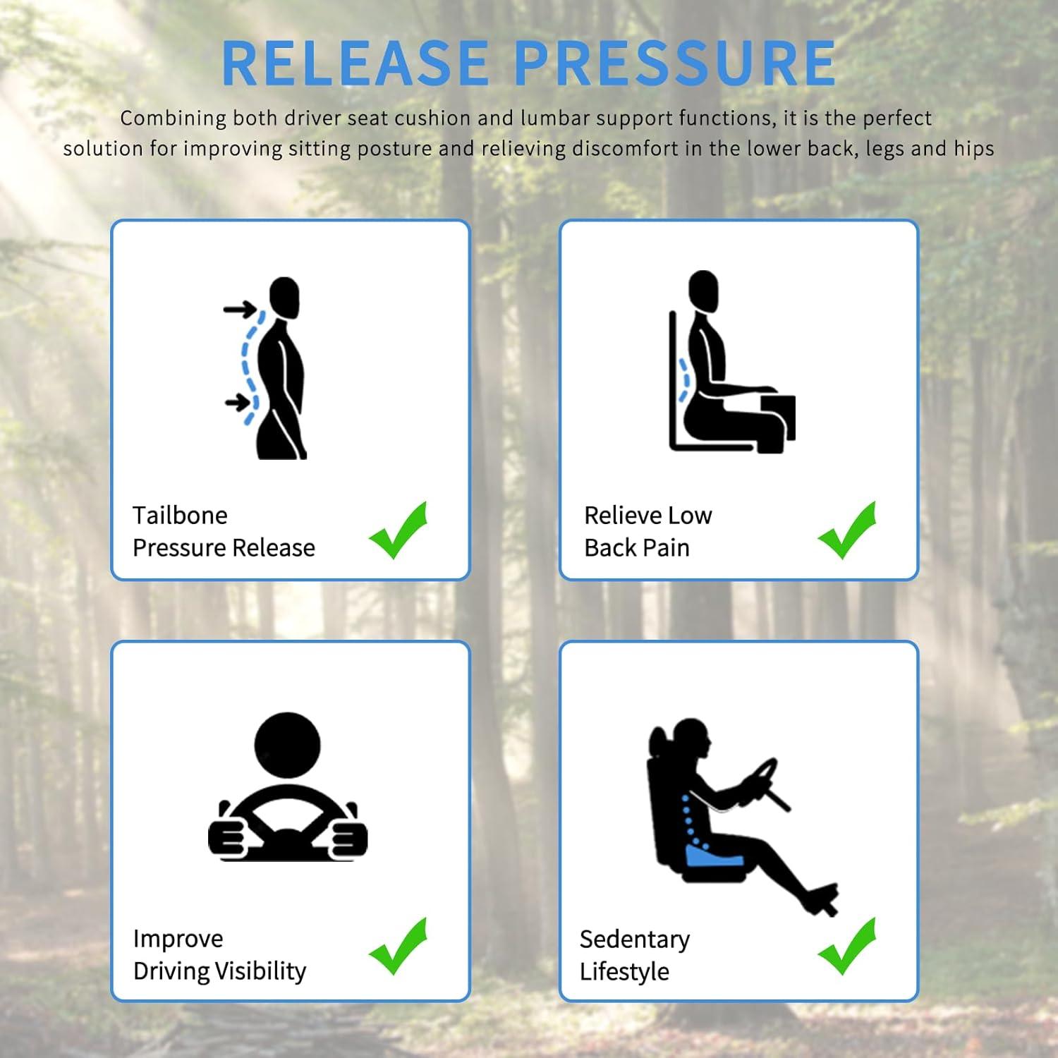 Multi Function: Combining both driver seat cushion and lumbar support functions, it is the perfect solution for improving sitting posture and relieving discomfort in the lower back, legs and hips. The “W” shaped memory foam relieving discomfort caused by prolonged sitting and keeping you in top shape while working or studying