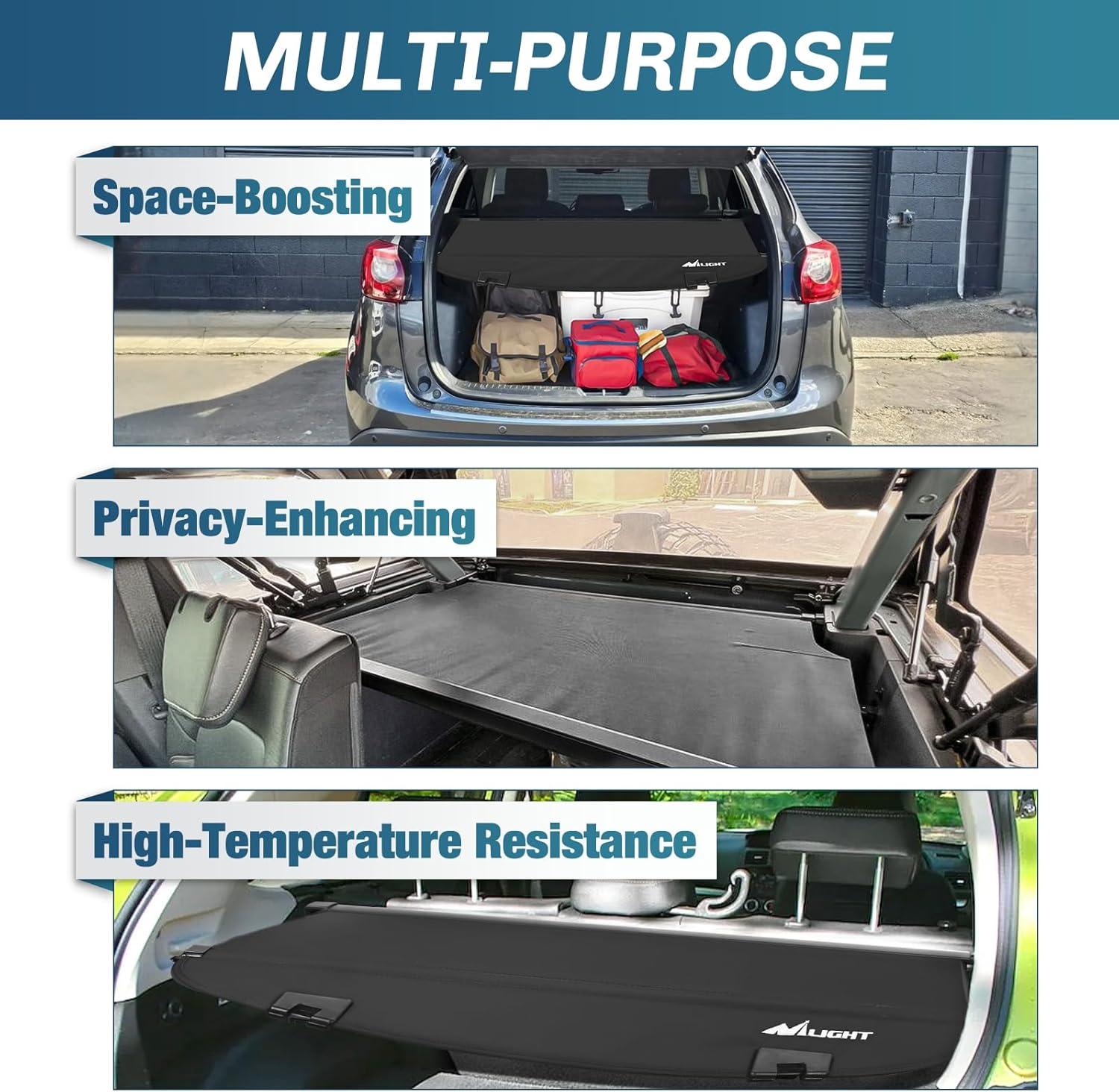 Security Upgrade: This cargo cover provides excellent privacy protection with an extra flap to cover the gap between the trunk and rear seats. It shields your belongings from UV damage and keeps them securely hidden, enhancing security
