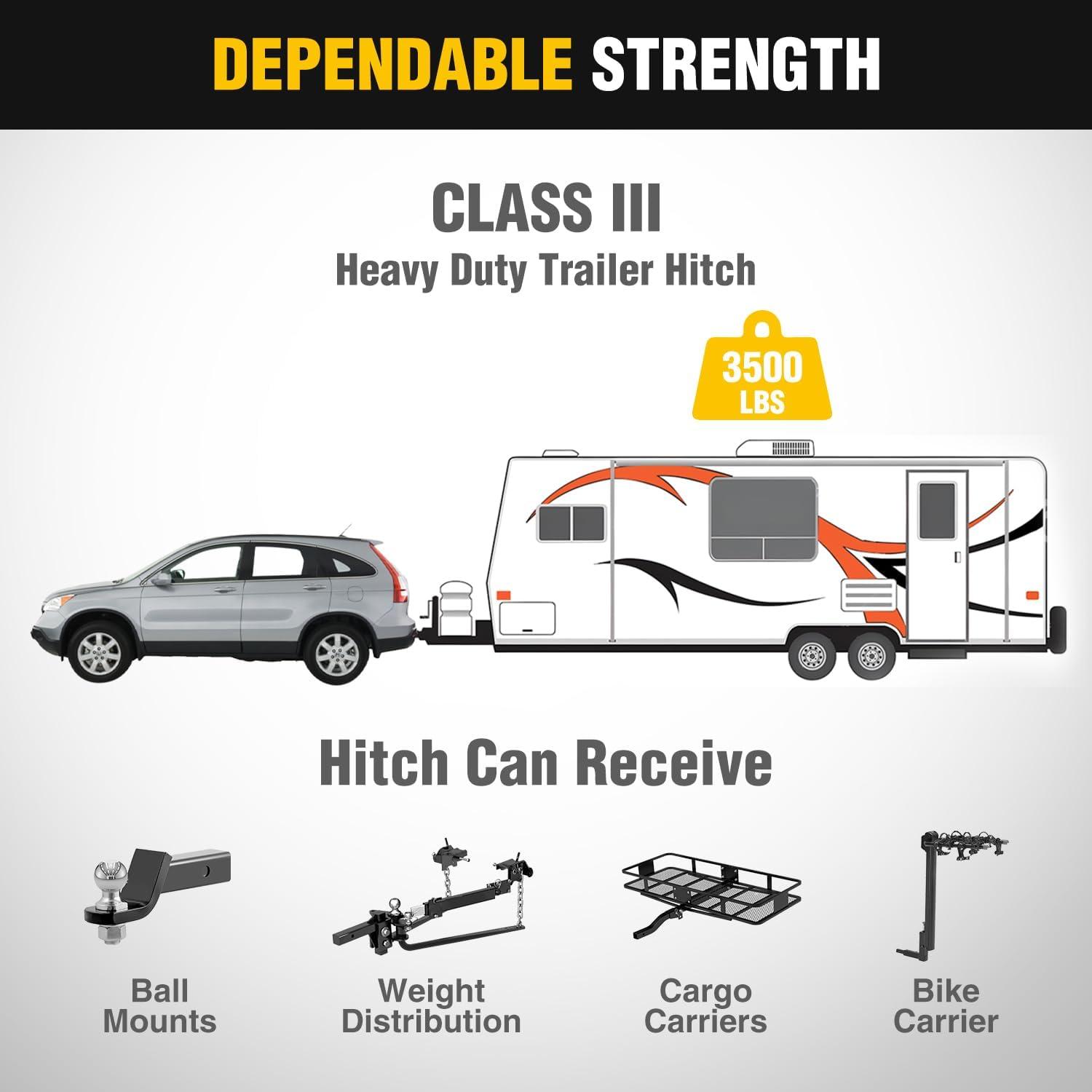 Towing Capacity: This trailer hitch is rated for 3,500 lbs, tongue weight 525 lbs