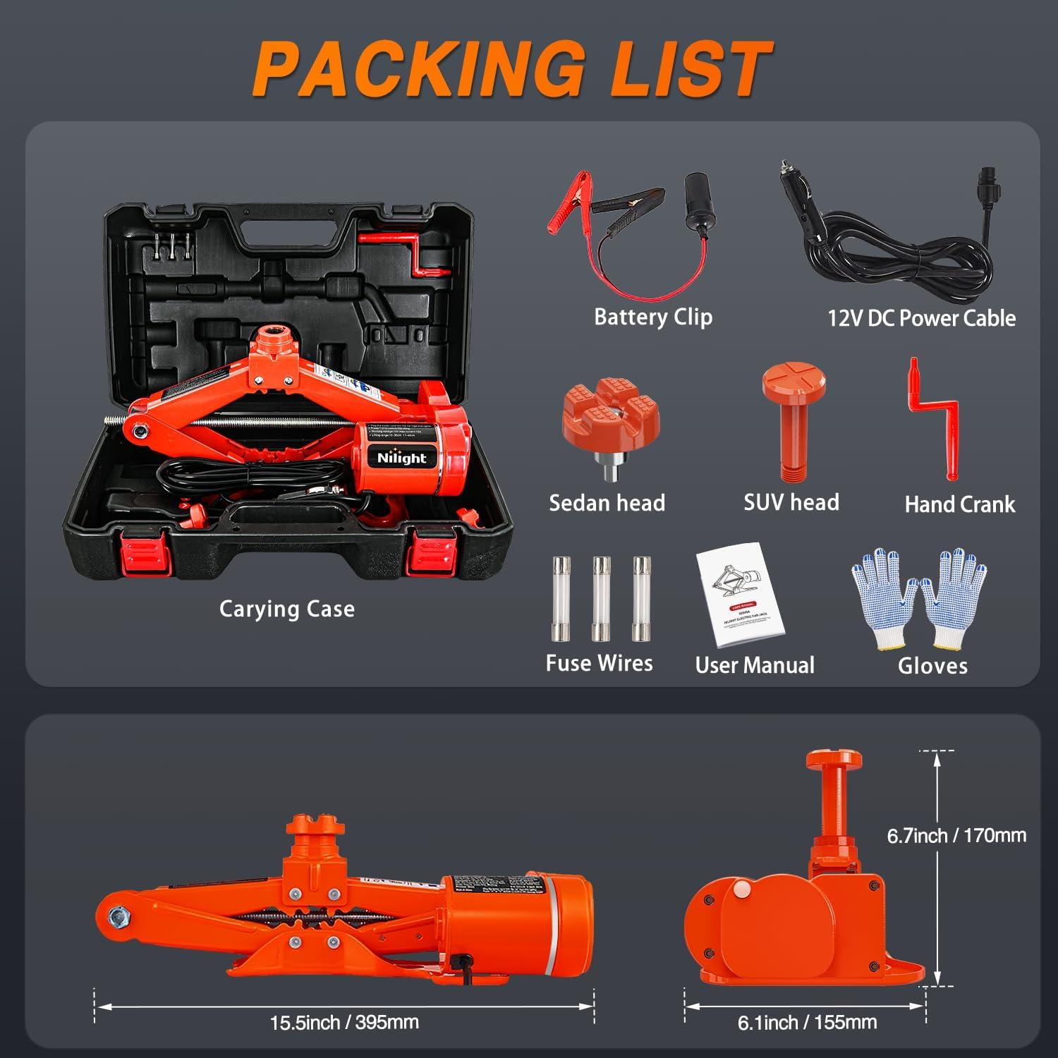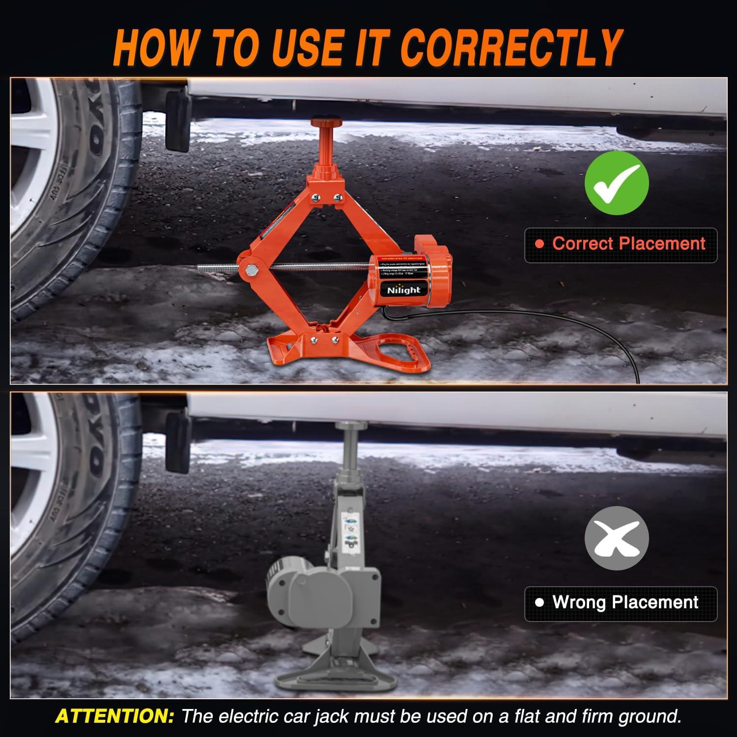 POWERFUL ELECTRIC JACK- Nilight electric scissor car jack has a lifting capacity of 3 tons, it can easily and quickly lift the car. The lifting range of the electric jack is 4.7”-13.8”/ 6.7”-16.5”, which is a well height to lift the car to change the tire. NOTE: Please place the electric jack on a flat ground for operation!
