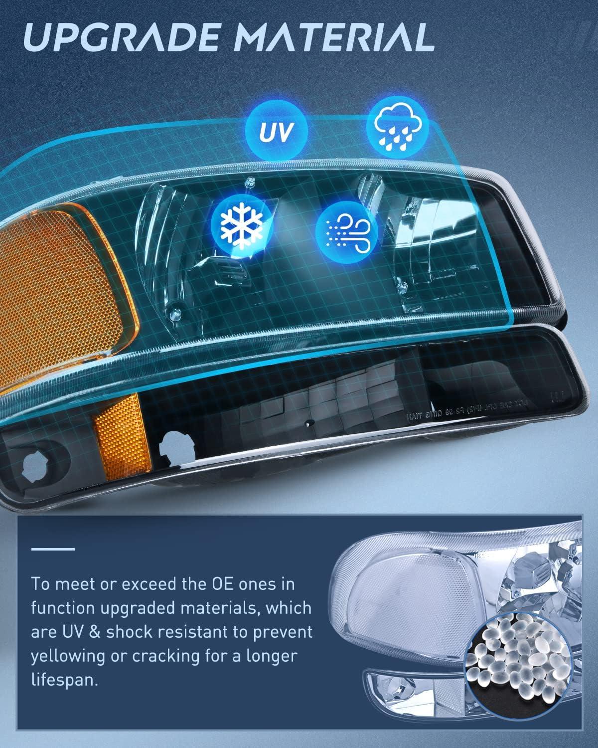 Waterproof IP65: The 1999-2006 GMC Sierra Headlights are made of fully sealed ABS plastics with tensile/impact strength. waterproof,dust and corrosion