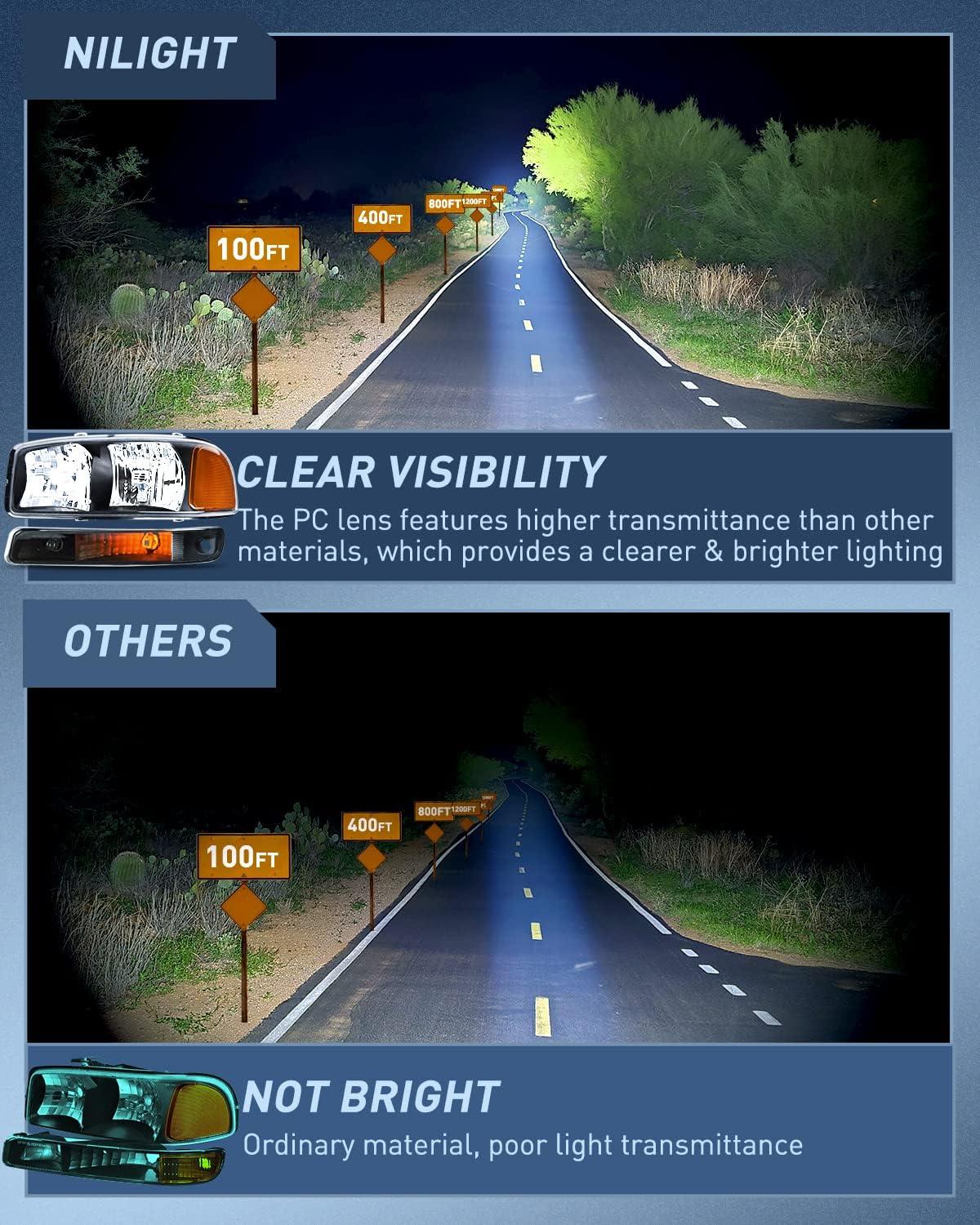 Nilight Headlight Assembly Compatible for 1999 2000 2001 2002 2003 2004 2005 2006 GMC Sierra Yukon, Smoke Bumper Light Chrome Housing Amber Corner Clear Lens, Headlights Assembly Replacement(Black Housing + Amber Reflector)